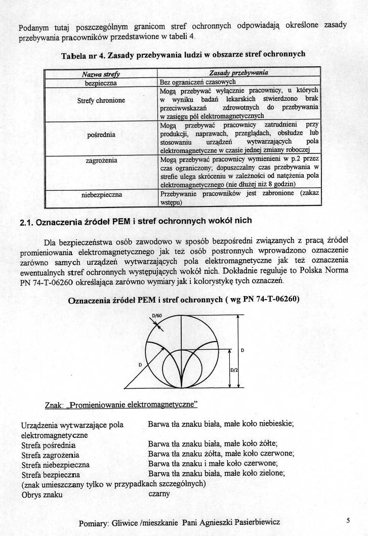 Politechnika Wrocławska Instytut Telekomunikacji i Akustyki Raport nr I-28/S-032/01 Badanie Opromieniowania Mieszkania nr 38 w Gliwicach przy ul. Solskiego 3 przez stację telefonii komórkowej, mieszkanie Pani Agnieszki Pasierbiewicz, Wrocław, lipiec 2001Tabela nr 4. zasady przebywania ludzi w obszarze stref ochronnych; Oznaczenia źródeł PEM i stref ochronnych wg (PN 74-T-06260) | |||||