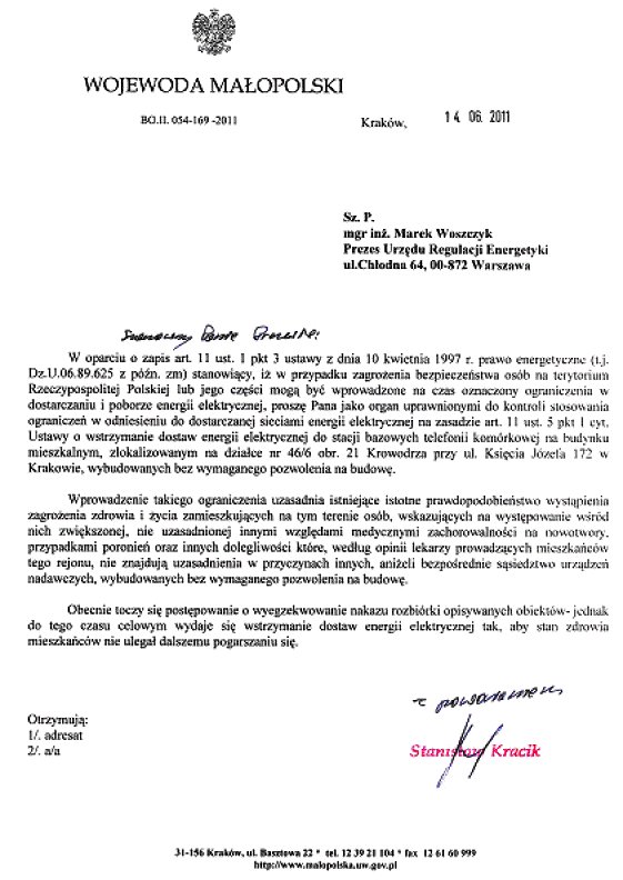 | 14.06.2011 Wojewoda Małopolski do mgr inż Marek Wuszczyk, Prezes Urzędu Regulacji Energetyki, ul. Chłodna 64 00872 Warszawa .pdf, 36 kB, list Szanowny panie prezesie W oparciu o zapis art. 12 ust. 1 pkt 3 ustawy z dnia 10 kwietnia 1997 r. prawo energetyczne (1j. Dz.U.06 89 625 z późn. zm.) stanowiący, iż w przypadku zagrożenia bezpieczeństwa osób na terytorium Rzeczypospolitej Polskiej lub jego części mogą być wprowadzone na czas oznaczony ograniczenia w dostarczaniu i poborze energii elektrycznej, proszę Pana jako organ uprawniony do kontroli stosowania ograniczeń w odniesieniu do dostarczanej sieciami energii elektrycznej na zasadzie art. 11 ust. 5 pkt 1 cyt. Ustawy o wstrzymanie dostaw energii elektrycznej do stacji bazowych telefonii komórkowej na budynku mieszkalnym, zlokalizowanym na działce nr 46/6 abr. 21 Krowodrza przy ulicy Księcia Józefa 172 w Krakowie, wybudowanych bez wymaganego pozwolenia na budowę. Wprowadzenie takiego ograniczenia uzasadnia istniejące istotne prawdopodobieństwo wystąpienia zagrożenia zdrowia i życia zamieszkujących na tym terenie osób, wskazujących na występowanie wśród nich zwiększonej, nie uzasadnionej innymi względami medycznymi zachorowalności na nowotwory, przypadkami poronień oraz innych dolegliwości które, według opinii lekarzy prowadzących mieszkańców tego rejonu, nie znajdują uzasadnienia w przyczynach innych, aniżeli bezpośrednie sąsiedztwo urządzeń nadawczych, wybudowanych bez wymaganego pozwolenia na budowę. Obecnie toczy się postępowanie o wyegzekwowanie nakazu rozbiórki opisanych obiektów - jednak do tego czasu celowym wydaje się wstrzymanie dostaw energii elektrycznej tak aby stan zdrowia mieszkańców nie ulegał dalszemu pogarszaniu się. Z poważaniem Stanisław Kracik | |
