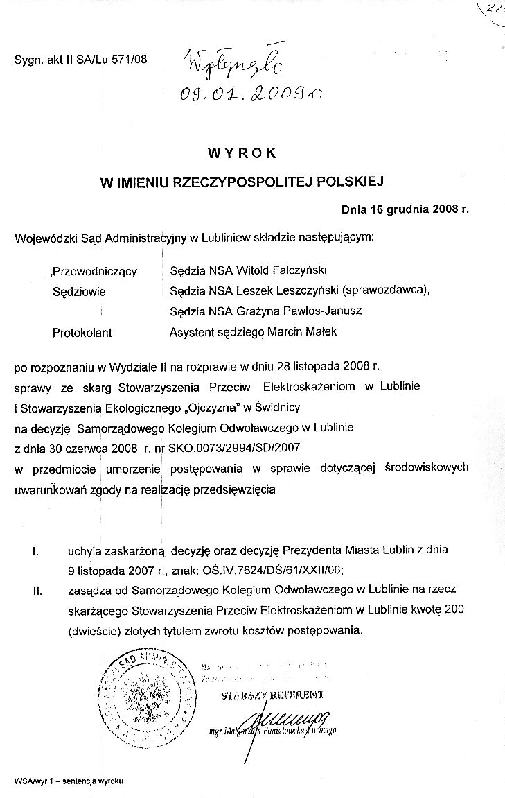 | Lublin. Sygn. akt II SA/Lu 571/08 - Wyrok WSA w Lublinie, Data orzecz enia 2008-12-16, wpłynęło 09.01.2009r. Wynik: Uchylono decyzję I i II instancji, Sentencja: Wojewódzki Sąd Administracyjny w Lublinie w składzie następującym: Przewodniczący Sędzia NSA Witold Falczyński, Sędziowie: Sędzia NSA Leszek Leszczyński (sprawozdawca),, Sędzia NSA Grażyna Pawlos-Janusz, Protokolant Asystent sędziego Marcin Małek, po rozpoznaniu w Wydziale II na rozprawie w dniu 28 listopada 2008 r. sprawy ze skarg Stowarzyszenia Przeciw Elektroskażeniom w Lublinie i Stowarzyszenia Ekologicznego "Ojczyzna" w Świdnicy na decyzję Samorządowego Kolegium Odwoławczego z dnia 30 czerwca 2008r. nr SKO.0073/2994/SD/2007 w przedmiocie umorzenie postępowania w sprawie dotyczącej środowiskowych uwarunkowań zgody na realizację przedsięwzięcia I. uchyla zaskarżoną decyzję oraz decyzję Prezydenta Miasta z dnia 9 listopada 2007 r., znak: OŚ.IV.7624/DŚ/61/XXII/06; II. zasądza od Samorządowego Kolegium Odwoławczego w na rzecz skarżącego Stowarzyszenia Przeciw Elektroskażeniom w Lublinie kwotę 200 (dwieście) złotych tytułem zwrotu kosztów postępowania. Stowarzyszenie Ekologiczne Ojczyzna 58-105 Świdnica Lublin. Skarga o uchylenie Decyzji SKO z dnia 30.06.2008r. Załączniki do skargi Strona skarżąca: Stowarzyszenie Ekologiczne Ojczyzna 58-105 Świdnica Strona przeciwna: Samorządowe Kolegium Odwoławcze w Lublinie ul. Zana 38c | ||||||||||