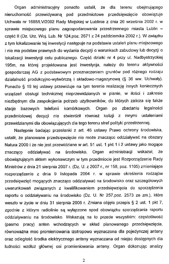 | Lublin. Sygn. akt II SA/Lu 571/08 - Wyrok WSA w Lublinie, Data orzecz enia 2008-12-16, wpłynęło 09.01.2009r. Wynik: Uchylono decyzję I i II instancji, Uzasadnienie wyroku c.d. : Organ administracyjny ponadto ustalił, że dla terenu obejmującego nieruchomość przewidywaną pod przedmiotowe przedsięwzięcie obowiązuje Uchwała nr 1688/LV/2002 Rady Miejskiej w L. z dnia 26 września 2002 r. w sprawie miejscowego planu zagospodarowania przestrzennego miasta L. - część II (Dz. Urz. Woj. Lub. Nr 124,poz. 2671 z 24 października 2002 r.). W związku z tym lokalizowanie tej inwestycji następuje na podstawie ustaleń planu miejscowego i nie ma podstaw prawnych do wydania decyzji o warunkach zabudowy lub decyzji o lokalizacji inwestycji celu publicznego. Część działki nr 4 przy ul. N. 195m, na której projektowana jest inwestycja, należy do terenu aktywności gospodarczej AG z podstawowym przeznaczeniem gruntów pod różnego rodzaju działalność produkcyjno-wytwórczą i składowo-magazynową (§ 36 ww. Uchwały). Ponadto § 19 tej ustawy przewiduje na tym terenie realizację innych koniecznych urządzeń obsługi technicznej nieprzewidzianych w planie, w ilości i zakresie niezbędnym dla zaspokojenia potrzeb użytkowni Stowarzyszenie Ekologiczne Ojczyzna 58-105 Świdnica Lublin. Skarga o uchylenie Decyzji SKO z dnia 30.06.2008r. Załączniki do skargi Strona skarżąca: Stowarzyszenie Ekologiczne Ojczyzna 58-105 Świdnica Strona przeciwna: Samorządowe Kolegium Odwoławcze w Lublinie ul. Zana 38c | ||||||||||