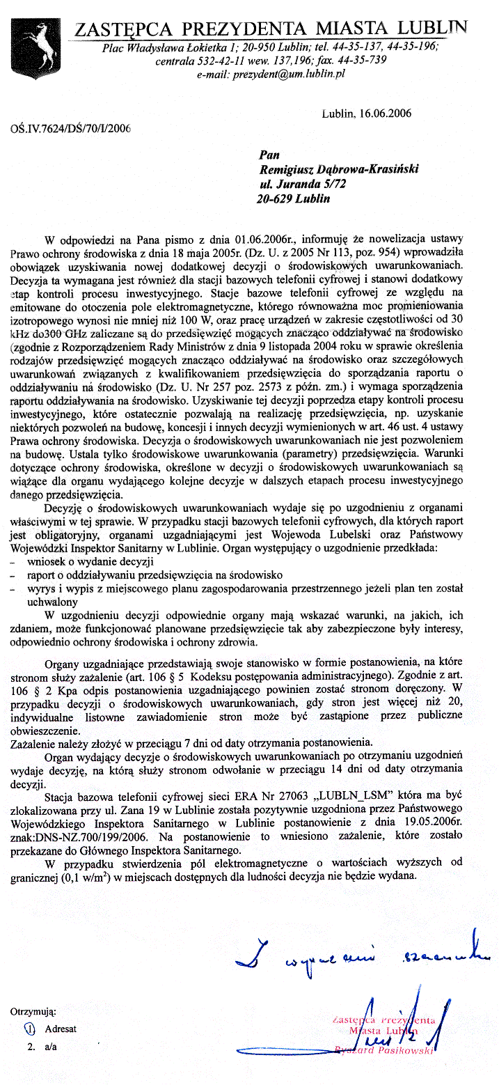 Lublin, strona główna Położenie Lublina Lublin, Folwarczna 37 4 maj 2006 r., Wydział Ochrony Środowiska zawiadomienie o postępowaniu administracyjnym 4 maj 2006 r., Wydział Ochrony Środowiska, prośba o uwagi przez wydział Środowiska i Rolnictwa oraz przez PWIS w Lublinie 13 maja, walka z inwazją Ery w Lublinie, hipermarket E. Leclerc Hipermarket E. Leclerc, mapa sytuacji 19 maja 2006, postanowienie PWIS, uzgadniam środowiskowe uwarunkowania dla ERA Nr 27063 Lublin-LSM 5 czerwca 2006 r., prośba PWIS o wydanie raportu 14 czerwca 2006 r., postanowienie Wojewody Lubelskiego 16 czerwca 2006 r., odpowiedź prezydenta miasta Lublin 20 czerwca 2006 r., przekazanie pisma przeciwników budowy masztów ERY do Prezydenta Miasta Lublin Andrzeja Pruszkowskiego Lublin, zdjęcia sytuacji Szczegół, który robi z raportów makulaturę Raport o oddziaływaniu na środowisko, Zana 19, Lublin 17 lipca 2006 r. pismo przedstawiciela 1000 protestujących osób pana Remigiusza Dąbrowa-Karasińskiego do Prezesa Lubelskiej Spółdzielni Mieszkaniowej, .doc, 28 KB 18 lipca 2006 r., Lubelska Spółdzielnia Mieszkanowa zażalenie na postanowienie wojewody lubelskiego z dnia 14.6.2006 r. exTaktyka falszowania raportów Lipiec 2006 r., w sprawie opracowania: "Raport oddziaływania na środowisko" , doc, 272,7 KB 19 lipca 2006, Prezes Spółki "Lublindis" wnosi zażalenie na postanowienie wojewody lubelskiego 26 lipca 2006, pismo do właściciela Pergranso Sp. z o.o. w Warszawie, .doc, 28 KB 21 sierpnia 2006, pierwszy sukces: Główny Inspektor Sanitarny unieważnia decyzję Wojewódzkiego 28 sierpnia 2006 potwierdzenie Remigiusz Karasiński jest stroną w walce przeciwko inwazji ERY 29 września 2006, Lublin-zwycięstwo, potwierdzenie decyzji Wojewódzkiego Inspektora Sanitarnego w Lublinie przez Głównego Inspektora Sanitarnego Andrzeja Wojtyłę |