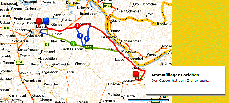 11 Castorów dotarło z ponad 30 godzinnym opóźnieniem we wtorek 9 listopada 2010 r. do Gorleben. Iddd.de jako jedyne uczciwe źródło podawało od początku prawdziwe oszacowania ilości milicji- 20000 ludzi. W ostatnim dniu ponad 20000 milicjantów* obrabiało 3000 zziębniętych pozostałych reprezentantów niemieckiego pospolitego ruszenia. Jak podaję na poprzedniej stronie w głównej demonstracji w sobotę wzięło udział ponad 60 000 osób Z poczucia zemsty? niszczyli oni jak horda wandali, a nie jak odpowiedzialni urzędnicy państwowi blokujące drogę traktory. Początki oficjalnej dyktatury: Niemiecki Minister d/s Wewnętrznych de Maiziere (CDU) mówi, że opozycja i demonstranci nie mieli prawa do samoobrony ! Bicie ludzi co nie należą do klasy średniej - nie jest uznawane jako gwałt, dlatego wg. propagandy mediów i policji - było wszystko bardzo sympatycznie i pokojowo, pomimo 1000 rannych demonstrantów, wg służb zostało rannych tylko 80 milicjantów. Setki rannych wśród młodych zaangażowanych ludzi z tzw. grup "aktywistów", nie są uwzględniane w ocenie politycznej, gdyż rannych z grup pozaparlamentarnych się w Niemczech nie liczy. Chyba że jako płatników. Aresztowano 1300 osób z których każda będzie prawdopodobnie musiała zapłacić za przetrzymanie i spisanie przynajmniej 80 Euro, czyli około 320 złotych polskich. Bicie i tortury mają cennik ekstra. Według szefa służb wewnętrznych de Maiziere, byłego ministra NRD, oraz "kurwy atomowej" A. Merkel to nie są obywatele, tylko przestępcy... Taki chwyt propagandowy zapożyczony od mistrza propagandy III Rzeszy Goebelsa, nie działa jednak w Sztuttgarcie, gdzie demonstruje klasa średnia i niższa wspólnie przeciwko projektowi mafii budowlanej: tam demonstrują adwokaci, lekarze, inżynierowie, aktorzy, technicy, robotnicy, uczniowie, studenci i dalsza szeroka rzesza mieszkańców Sztuttgartu. Konserwatywni mieszkańcy Stuttgartu, którym się otworzyły oczy, jak będą dobrze kontrolować wybory w marcu 2011 to wyczyszczą parlament w Sztuttgarcie z otwarcie skorumpowanych szui jak Mappus i Rech z CDU i CSU. Skuteczne podkopywanie, czy rozebranie torów na trasie Castora niestety nie było możliwe, gdyż było za dużo milicyjnej ochrony na ostatnich 50 kilometrach, aż do przeładunku w Dannenbergu. Bojówki milicyjne krążyły po lesie, gdzie wyłapywali i bili mniejsze grupy aktywistów zdążające w kierunku torów kolejowych - stosunkek 6 milicjantów na jednego aktywistę. Państwowymi usługami ochroniarskimi dla czterech koncernów produkujących prąd atomowy, politycy obciążają podatników. Tegoroczną ochronę transportu szacuje milicja, w przeliczeniu, na 300 000 milionów złotych, czyli 100 000 milionów na dzień. Tymi kosztami politycy rządzącej w Niemczech neoliberalnej koalicji z CDU/CSU i FDP nie będą obciążać producentów prądu atomowego- jeden z powodów dlaczego mafia atomowa mówi o "tanim" prądzie atomowym. Następne przestępstwo neoliberalnych bestii Partie CDU/CSU wykluczają zdecydowanie składowanie odpadów na południu Niemiec w Bawarii i Baden-Wittenbergii. Jeżeli w Gorleben (Dolna Saksonia) się nie uda, gdyż opór ludności bardzo dużo kosztuje, to Seeehofer (CSU) planuje trasportować odpady radioaktywne na Syberię. Czy będą transportować przez Polskę - tego jeszcze nie wiadomo. Aktualnie testują oni wywózkę do Rosji, czyli jest dużo zasłon dymnych - mówi się o składowaniu odpadów w miejscu elektrowni jądrowych w Philippsburgu, czy w Biblis. Faktycznie jednak jest już decyzja do wywózki odpadów radioaktywnych byłego instytutu badawczego Rossendorf z NRD do najbardziej skażonego ośrodka na świecie - wiecej niż Czarnobyl - ośrodka badawczego Majak - 2000 Km od Moskwy. Na szczęście, na początek mają w planie ominąć Polskę, drogą wodną. Majak; zbiorniki z odpadami radioaktywnymi w najbardziej skażonym na świecie instytucie MAJAK w Rosji. MAJAK jest pierwszym celem wywózki odpadów radioaktywnych do Rosji. Rosja również nie ma ani wysypiska ani koncepcji na wieczne składowisko.Inaczej jest w Szwecji i Finnlandii. Wybrane miejsca na "wieczne" składowisko dla materiałów radioaktywnych mają zgodę kupionych przez koncern Vattenfall 20 mieszkańców mieszkających w okolicy składowiska. Skandynawowie nas rozczarowują jak bełkocą w tym miejscu o demokracji. Wybrano wioskę z 28 mieszkańcami z których tylko 8 nie dało się przekupić. Taktyka szwedzkiej i fińskiej mafii atomowej opłacanej przez koncern Vattenfall wcale nie jest demokratyczna. Problem odpadów nie jest lokalnym problemem, elektrownie atomowe to nie jest problem dla referendum lokalnego jednej kupionej wioski. Problem elektrownii atomowych i składowania odpadów jest problemem ogólnopaństwowym ! Dlatego decyzje w temacie atomowym powinny być poddane sprawdzalnemu referendum ogólnopolskiemu. Niemcy wydali na zbadanie Gorleben 6 miliardów złotych, i jeszcze nie ma decyzji. A premier polski D. Tusk ma zamiar budować na zlecenie służb francuskich elektrownie jądrową w Polsce nie mając składowiska na odpady. Polacy trzeba tą neoliberalną mafię wraz z "dobroczyńcą" Sorosem i Tuskiem wyrzucić z Polski! Samoobrona jest prawem człowieka, niemiecka ludność pokazuje wyraźnie, że jednostronne wymówienie konsensusu o wyjściu z energii atomowej przez przekupioną Merkel, nie jest akceptowane ani przez ludność okoliczną, ani przez społeczeństwo, ani przez partie opozycyjne. Z takimi politykami, nie stosującymi się do umów podpisanych poprzez poprzednią koalicję rządową, z zielonych "Die Grünen" i socjaldemokracji (SPD), polski lud w demokracji bezpośredniej nie będzie miał problemów. Złe mowy z Unią, Niemcami i Rosjanami da się ludności do oceny w referendum narodowym. W przypadku ich nie potwierdzenia wymówi się je jednostronnie jak to pokazuje Kanclerz Niemiec Angela Merkel z przedstawicielam