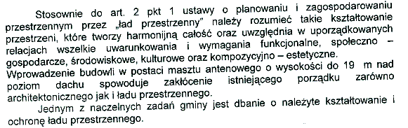 Gratulacje dla Brodnicy, odmowa nr 11Brodnica, dnia 22 maja 2006r. cały dokument, .pdf, 190,4 KB DECYZJA NR BA. 7331 - 73/P/05/06Na podstawie art. 104 Kodeksu postępowania administracyjnego (tekst jednolity Dz.U. z 2000 r. Nr 98 poz. 1071 z późn. zm.), art. 6 ust. 2 pkt 1, art. 36 ust.1 w związku z art. 58 ust. 2 ustawy z dnia 27 marca 2003r. o planowaniu i zagospodarowaniu przestrzennym (Dz. U. Nr 80, poz.717 z późn. zm.) oraz decyzji Samorządowego Kolegium Odwoławczego w Toruniu z dnia 9 lutego 2006r. nr SKO-/5/B/06 po ponownym rozpoznaniu wniosku: z dnia 31 maja 2005r. Pana Grzegorza Kerlina - Przedsiebiorstwa ATTEX sp. z o.o. z siedzibą w Sopocie przy ul. Jana z Kolna 35 odmawiam ustalenia lokalizacji inwestycji celu publicznego Polskiej Telefonii Cyfrowej sp. z o.o. z siedzibą w Warszawie przy Al. Jerozolimskich 181 dla inwestycji polegajqcej na lokalizacji stacji bazowej telefonii komórkowej na istniejącym kominie zlokalizowanym na terenie działki nr 905/6 położonej przy ulicy Podgórnej (teren Zakładów Żelatyny) wraz z przyłączem energetycznym. Uzasadnienie (fragmenty)