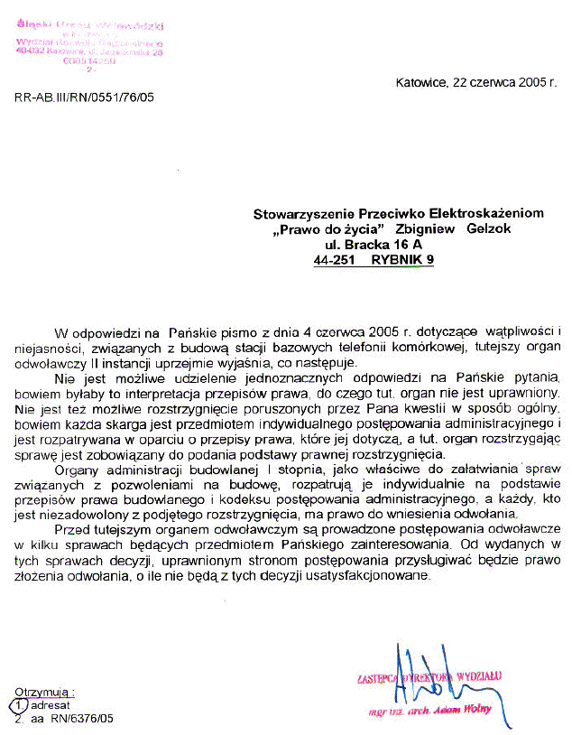Stowarzyszenie Przeciwko Elektroskażeniom Rybnik 2005-06-04 "Prawo do życia" Gelzok Zbigniew Ul. Bracka 16 A 44-251 Rybnik 9 Wojewoda Ślaski Ślaski Urząd Wojewódzki w Katowicach Przez Śląski Urząd Wojewódzki w Katowicach, Wydział Rozwoju Regionalnego Ul. Jagiellońska 25 40-032 Katowice. W związku z tym, że operatorzy twierdzą że stacje bazowe telefonii komórkowej mogą być budowane na zgłoszenie chciałbym uzyskać jednoznaczną odpowiedź zanim zwróce się do wszystkich możliwych instytucji. 1. Zgodnie z opiniami klubów poselskich, władz jak i Wojewody Śląskiego stacje bazowe telefonii komórkowej są budowane, a nie montowane i zgodnie z poniższymi przepisami jedynie w następujacy sposób mogą być zatwierdzone w drodze decyzji. "Prawo Ochrony Środowiska" Art.46. 1. Wydanie decyzji w sprawie planowego przedsięwzięcia mogąco znacząco oddziaływać na środowisko wymaga, z zastrzeżeniem ust. 7. przeprowadzenia postępowania w sprawie oceny oddziaływania na środowisko. 4. Decyzją, o której mowa w ust. 1, jest: 1) decyzja o warunkach zabudowy i zagospodarowania terenu-wydawana na podstawie przepisów ustawy o planowaniu i zagospodarowaniu przestrzennym, 2) decyzja o pozwoleniu na budowę obiektu budowlanego oraz decyzja o pozwoleniu na zmianę sposobu użytkowania obiektu budowlanego lub jego części, wydawana na podstawie ustawy z dnia 7 LIPCA 1994 r.- Prawo budowlane. Oczekuje odpowiedzi na powyższe i czy Wojewoda Śląski zgadza się z tym. 2. Proszę o odpowiedż czy jakakolwiek budowa stacji bazowej telefonii komórkowej nie jest przedsięwzięciem mogąco znacząco oddziaływać na środowisko. 3. Czy w świetle przepisów i ustaw jest odstępstwo od powyższego albowiem zgłoszenia operatorów w niektórych przypadkach nie dotyczą przedsięwzięcia tylko montażu urządzeń zgodnie z Prawem Budowlanym co nie dotyczy budowy stacji bazowej telefonii komórkowej i tym samym taka forma zgłoszenia nie ma żadnego umocowania prawnego i automatycznie powoduje, iż ma zastosowanie , "Prawo Ochrony Środowiska" Art. 11 więcej |