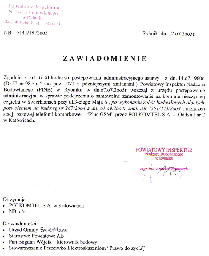 Dokument Prezydenta Miasta Rybnika z którego jasno wynika, że urzędnik Janusz Piekarczyk zlekceważył mieszkańców Ochojca, okłamał Prezydenta w tamtej sprawie oraz Pan Prezydent Miasta Rybnik Adam Fudali przyznaje, że legalizacja montażu stacji bazowych telefonii komórkowej opiera się o pozwoleniu na budowę, a nie na zgłoszeniu, co podkreślił w piśmie. Nieuznawanie stowarzyszenia za stronę to sprawa pana Adama Wolnego z Urzędu Wojewódzkiego, który jest na usługach operatorów i to nie podlega dyskusji, dla nich łamie prawo. Pozdrawiam Zbigniew Gelzok. 01 Jul 2005 patrz odpowiedź prezydenta, pdf, 128 KB |