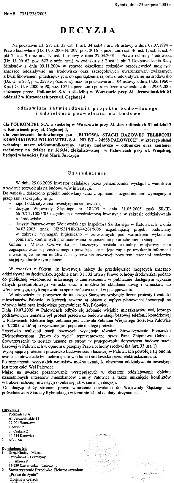 Rybnik: Palowice, Jejkowice - totalna klęska PLUS-GSM, urzędnik jest dla mieszkańców i urząd równieżPrzesyłam panu drugą decyzję Starosty Rybnickiego, pana mgr Damiana Mrowiec, który pokazał prawdziwe, szczere i uczciwe stanowisko władz Starostwa. On potwierdził, zgodnie z Kodeksem Postępowania Administracyjnego, że urzędnik jest dla mieszkańców i urząd również. Każdy mieszkaniec powiatu rybnickiego może być dumny i szczęśliwy, że ma takiego włodarza. To bezczelnych operatorów zaboli mocno. Mogą skomentować. Pozdrawiam Zbigniew Gelzok. Palowice: odmawiam zatwierdzenia projektu budowlanego i udzielenia pozwolenia na budowę dla Polkomtel S.A. z siedzibą w Warszawie oddział 2 w Katowicach przy ul. Ceglanej 4 dla zamierzenia budowlanego p.n. "Budowa stacji bazowej telefonii komórkowej Polkomtel S.A. Nr BT - 24558 Palowice", w którego skład wchodzą: maszt telekomunikacyjny, anteny nadawczo - odbiorcze, kontener techniczny na działce nr 166/34, zlokalizowanej w Palowicach przy ul. Wiejskiej, będącej własnością Pani Marii Jurczyga Palowice: odmawiam zatwierdzenia projektu budowlanego budowy stacji bazowej telefonii komórkowej Polkomtel S.A. oryginał .pdf., 126 KB Jejkowice: odmawiam zatwierdzenia projektu budowlanego budowy stacji bazowej telefonii komórkowej Polkomtel S.A. oryginał .pdf., 120 KB |