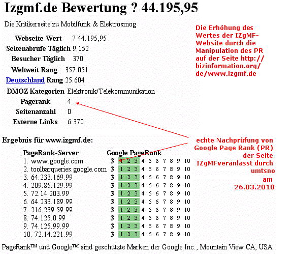 ![]() 31.03.2010 Krzysztof Puzyna Am Freitag, den 26. März 2010, um 15:00 Uhr endete die Kommentarphase auf mitreden-u.de/ Die Idee von Mitreden-U setzt sich für die Ratifizierung der Aarhus- Konvention durch Deutschland ein. Die Aarhus-Konvention verpflichtet Deutschland, die Kontrolle von Vorgängen und Entscheidungen der Verwaltung im Bereich der Umwelt für Interessierte oder betroffene Bürger zu ermöglichen. Die Bürgerbefragung, die durch das Umweltministerium veranlaßt wurde, wäre damit einer der ersten Versuche, mittels Onlinebeteiligung der breiten Öffentlichkeit eine wirksame Kontrolle der Verwaltungsentscheidungen im Bereich der Umwelt zu ermöglichen. Der Eindruck, dass wir beim Mitreden-U mit einem Wettbewerb der Themen zu tun hätten, wäre fehl am Platz. Nach dem Ratifizieren am 15. Januar 2007 der Aarhus-Konvention durch Deutschland darf schon ein Bürger die Überprüfung eines Vorhabens, das die Umwelt beeinflußt, einfach veranlassen. siehe demokracjakulista.pl/umtsno/recht.htm#asve Das Design der Seite Mitreden-U und ihre Verbreitung über Kontakt- Seiten der Sozialen Netzwerke, wie Facebook, Twitter oder Mister- Wong, spricht eher Kinder und Jugendliche als aktive Umweltaktivisten an. Darum wurde diese Initiative wochenlang von den meisten Mobilfunkgegner und auch von mir nicht wahrgenommen. Aber nach und nach stellte sich für mich heraus, dass diese Seite eine große Plattform für alle mögliche Umweltanliegen sein könnte. Als ich versuchte, meinen ersten Beitrag auf der Seite - Mitreden-U- zu veröffentlichen, wurde mir die Diskriminierung des Themas "Umweltverschmutzung und Gesundheitsschäden durch den Mobilfunk" sichtbar. Es gab keine Themenrubrik für den Mobilfunk. Das Umweltministerium hat das Thema ganz und gar nicht berücksichtigt, obwohl die Strahlenschutzkommission und Behörde für Strahlenschutz Millionen von Forschungsgeldern erhalten. Mein Austausch am 12. März 2010 mit der Moderation führte zur folgenden Aussage: "Autor: Antwort der Moderation | 14.03.2010 - 23:11: Hallo umtsno, danke für den guten Hinweis, den ich allerdings kurz vor Abschluss des Online-Dialogs nicht mehr umsetzen kann. Deswegen möchte ich Sie bitten, Beiträge zu den Risiken der Mobilfunkstrahlung zunächst unter "Sonstiges" einzustufen. In der Auswertung werden diese Beiträge sicherlich eine eigene Rubrik/Kategorie erhalten. MfG" Darum versuchte ich sensible und spezifische Themen zur vernichtenden Schädlichkeit des Mobilfunks in den Beiträgen 3 und 4 anzuzeigen. Diese Texte wurden unter dem Vorwand, sie existieren bereits (auf meiner Seite demokracjakulista.pl), gesperrt. Ich, durfte mich selbst nicht zitieren.. Der Artikel über "Prof. Dr. A. Lerchl und IZgMF - Etikettenschwindel !" ist dadurch zum Hauptartikel zum Thema Mobilfunk geworden. Nur, als ich den Beitrag auf Mitreden-U veröffentlichte, war er längst auf mehreren anderen Seiten sichtbar. Sie verstehen, dass ich mit solchem Argument die Entsperrung der wichtigsten Themen nicht vorantreiben wollte. Danach wäre möglicherweise auch dieser Artikel durch die Moderation gesperrt worden. Die Themen der gesperrten Seiten wurden dem Publikum nur über von mir gestreute Kommentare bekannt. Die Seiten mit den gesperrten Beiträgen wurden bis zum Schluß, trotz meiner Mail an die verantwortliche parlamentarische Staatssekretärin, Katherina Reiche, nicht entsperrt. Sie hat mir auch nicht geantwortet. Somit wurde der Beitrag über die Manipulationen von Lerchl und IZgMF zum Hauptbeitrag über Mobilfunk und Elektrosmog. Er erreichte in der Kategorie Kommentare mit 32 Kommentaren den siebten Platz unter 960 Einträgen. Die nur 8 Unterstützungen in der Kategorie Unterstützungen zeigten, wie wenig solidarisch die Mobilfunkgegner waren und sind. Zwei Artikel über Mücken, Spatzen und über das Fällen der Bäume für den Richtfunk wurden zusammen mit etlichen Kommentaren und jeweils 2 Unterstützungen nach einer Stunde online, gesperrt. Der Sperrung und dann der Löschung sind auch 7 Kommentare zum Hauptbeitrag zum Opfer gefallen. Insgesamt wurden zum Thema Mobilfunk 2 Artikel und 12 Kommentare gesperrt/gelöscht. Die meiste Aufmerksamkeit konnte die Idee der "Lichtreinigung" an sich ziehen. Die Lichtverschmutzungsgegner sind mit zwei Artikel angetreten und waren angeblich international organisiert. Sie brachten es auf 214 Unterstützer und 140 Kommentare. Meine Anmerkungen unter dem Beitrag "Lichtverschmutzung auf ein Minimum begrenzen": Ich möchte die dunklen Strassen wie in Rumänien oder Bulgarien in Hamburg nicht erleben müssen. Und bei der "Lichtreinigung" handele es sich möglicherweise um eine Inszenierung des Bundesumweltministers Dr. Norbert Röttgen, wurde mir mit sehr krassen Kommentaren geantwortet. Objektiv gesehen, die Strassenbeleuchtung abzuschalten ist leichter als die Formel 1 zu verbieten. Dazu braucht man weder Diskussionen noch größere Ausreden, man tut's einfach wie 1980, als der General Jaruzelski der Kriegszustand in Polen ausgerufen hatte und Lichter pünktlich um 20 Uhr ausschaltete. Er verordnete das auch um Energie zu sparen. Der Hohn der Schreibtischtäter von IZgMF über das magere Abschneiden des Themas "Mobilfunk" beinhaltet gravierende Fehler. Der Spatenpauli "bedankt" sich bei mir für erhöhte Zugriffe: "Danke, die Zugriffe aufs IZgMF haben sich seit Beginn der Streiterei um rund 20 % erhöht. Leider ist die Site dadurch nicht noch wertvoller geworden, als sie es zuvor schon war" -siehe ex Mitreden-U: Mobilfunk landet auf Platz 352 Das ist natürlich ein Trugschluss, in der Terminologie von IZgMF- Teilnehmer eine LÜGE!! Spatenpauli operiert mit einem alten (Stand: 17.12.2009) überhöhten Wert 4 von PageRank (PR) für IZgMF. Seit dieser Zeit hat Google die Seite von IZgMF von 4 auf 3 nach unten korrigiert. Damit müßte der Wert der Site sich auf das Niveau von demokracjakulista.pl zu bewegen und halbieren... Wenn in der Berechnung die alten Werte immer noch erscheinen, d