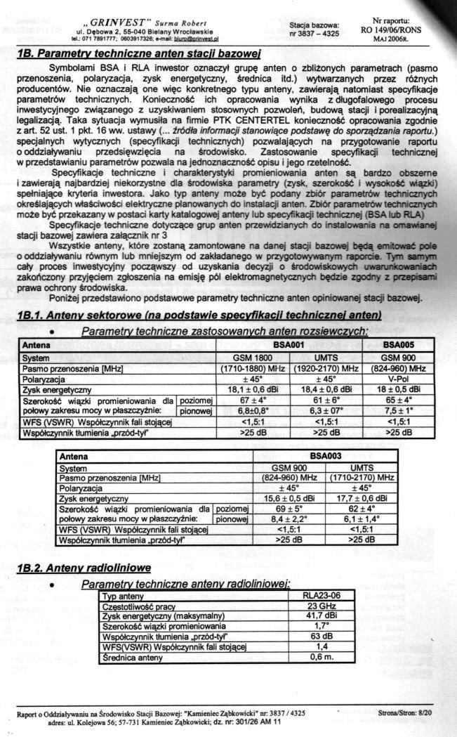 Parametry techniczne anten stacji bazowej. Parametry techniczne anteny radioliniowej i anten sektorowych. Raport o oddziaływaniu przedsięwzięcia na środowisko nr RO 149/06/RONS rozbudowa stacji bazowej nr 3837/4325 "Kamieniec Ząbkowicki" PTK Centertel Orange (France Telecom) w Kamieńcu Ząbkowickim. EIRP "jest?" 15968 W (>100 W), Nr działki 301/26 AM 11, 57-731 Kamieniec Ząbkowicki, Kolejowa 56, autorem opracowania jest mgr inż. Robert Surma, mai 2006, Grinvest.