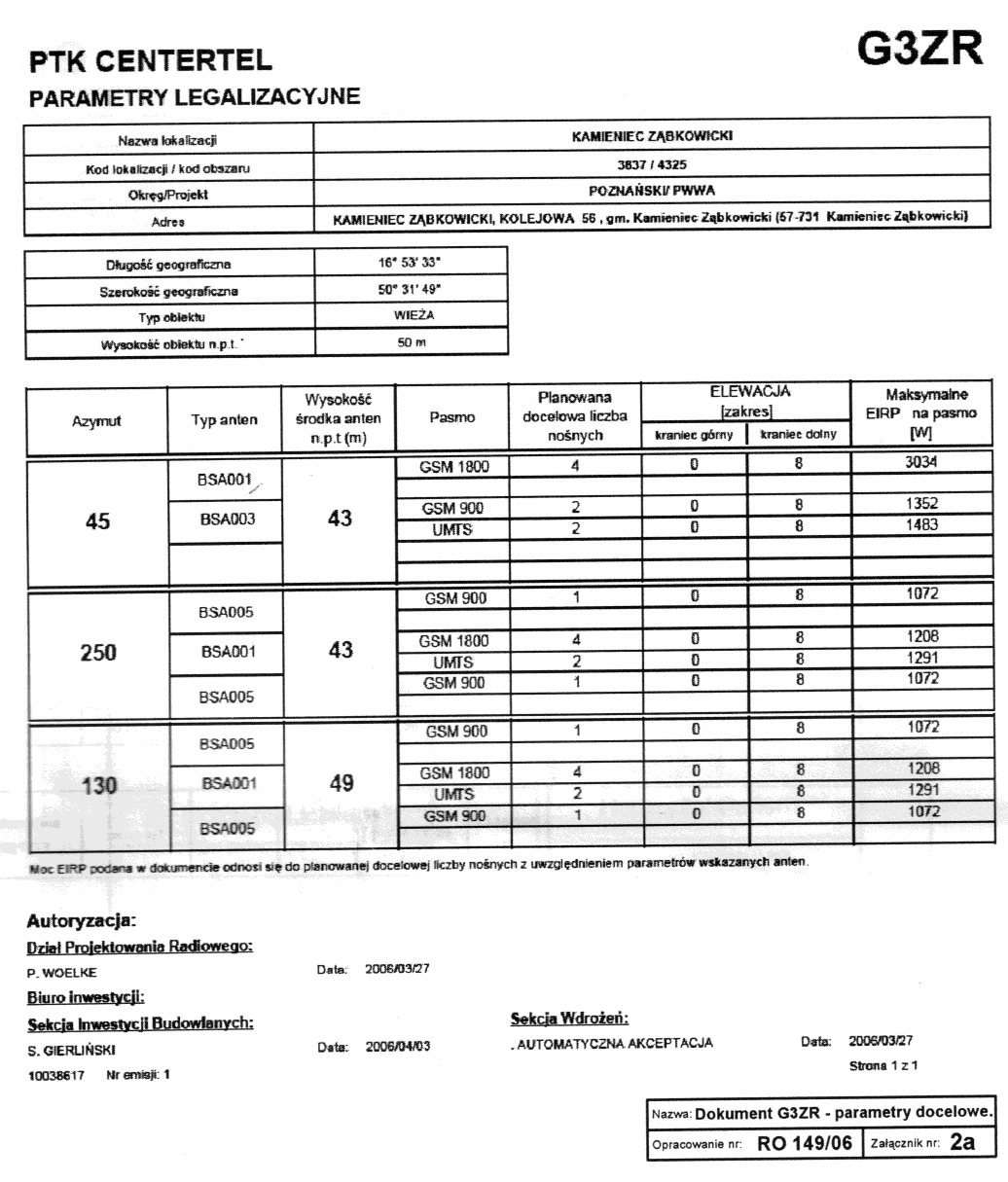 | Parametry legalizacyjne, docelowe, G3ZR PTK Centertel. Raport o oddziaływaniu przedsięwzięcia na środowisko nr RO 149/06/RONS rozbudowa stacji bazowej nr 3837/4325 "Kamieniec Ząbkowicki" PTK Centertel Orange (France Telecom) w Kamieńcu Ząbkowickim. EIRP "jest?" 15968 W (>100 W), Nr działki 301/26 AM 11, 57-731 Kamieniec Ząbkowicki, Kolejowa 56, autorem opracowania jest mgr inż. Robert Surma, mai 2006, Grinvest. | ||