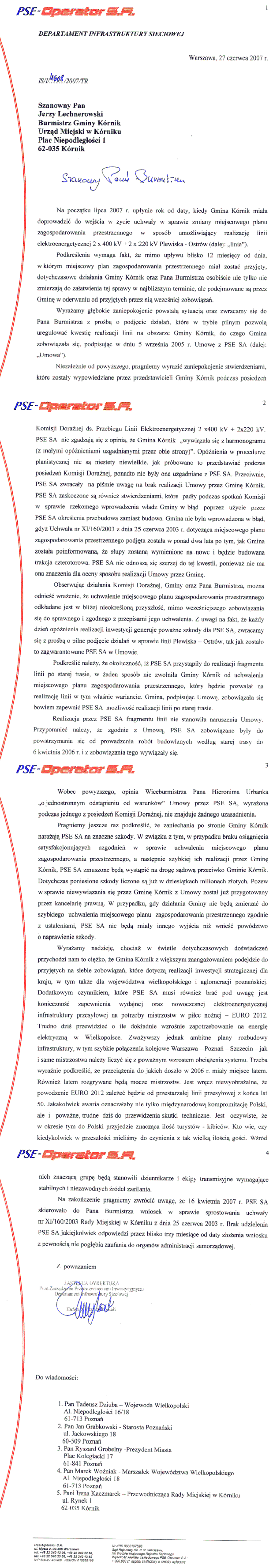 Według Krzysztofa Kuklińskiego - patrz też oryginalny plik (.pdf, 373,2KB) pani Mazur pisze: W związku z pismem Kancelarii Prezydenta Rzeczypospolitej Polskiej znak: BLO060/9451/42/45/46/47/07/MW przekazującym wystąpienie Pana dotyczące planowanej budowy przez Polskie Sieci Elektroenergetyczne S.A. czterotorowej, dwunapięciowej linii napowietrznej, relacji Plewiska - Ostrów jak i ogólnych kwestii oddziaływania linii elektroenergetycznych wysokiego napięcia na środowisko wyjaśniam, że z uwagi na planowaną zmianę trasy, Polskie Sieci Elektroenergetyczne S.A., zrezygnowały z budowy ww. linii i złożyły wniosek do Wojewody Wielkopolskiego o umorzenie postępowania w sprawie uzyskania decyzji o środowiskowych uwarunkowaniach dla planowanego przedsięwzięcia |