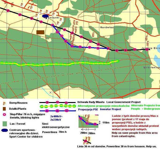 Sehr geehrte Damen und Herrenwenn Sie der Meinung sind, dass alle Kinder Recht haben, gefahrlos zu leben, wenn Sie meinen, dass alle Menschen Recht auf Umweltschutz haben, wenn Ihrer Meinung nach große Unternehmen das Recht nicht missachten dürfen und ihre Investitionen, die bewaffneten Leute schützen, nicht durchführen dürfen, wenn Ihnen solche Worte wie Anständigkeit und Gerechtigkeit nicht fremd sondern von der größten Bedeutung sind, wenn Sie nicht wollen, dass jemand über Nacht hinter Ihrem Rücken nicht weit von Ihren Häusern Masten (Spannung 2x400kV und 2x220kV), die über 70m hoch sind, die rot blitzen und mit 26 Leitungen in der Entfernung von 500 m lärmen und Ihren Kindern gefährden, baut, lesen Sie bitte unsere Petition, sehen Sie sich unseren Folder und Film an und dann,wenn Sie überzeugt sind, dass wir Recht haben, dagegen zu protestieren, unterschreiben Sie bitte unsere Petition. Wir wären Ihnen sehr dankbar, wenn Sie uns damit helfen möchten. Protestierende Einwohner aus Kamionki, Borówiec, Daszewice und Skrzynki (Gemeinde Kórnik und Gemeinde Mosina) Fotos vom Protest - exlink Unsere PETITION - exlink Die Liste mit allen Unterschriften - exink |