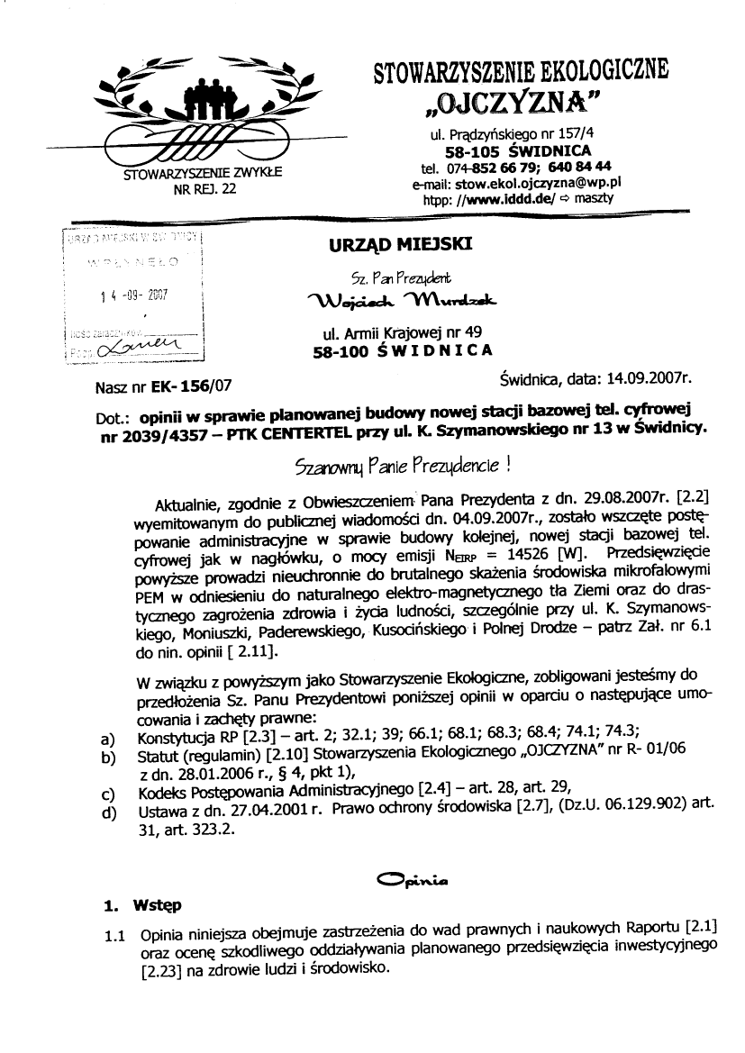 | URZ¡D MIEJSKI, Wojciech Murdzek ul. Armii Krajowej nr 49 58-100 ¦widnica Nasz nr EK- 156/07 ¦widnica, data: 14.09.2007r. Dot.: opinii w sprawie planowanej budowy nowej stacji bazowej tel. cyfrowej nr 2039/4357 - PTK CENTERTEL przy ul. K. Szymanowskiego nr 13 w ¦widnicy. wiêcej w pliku: plik oryginalny w ca³o¶ci, .doc, 400,7 KB Za³±czniki: | |
