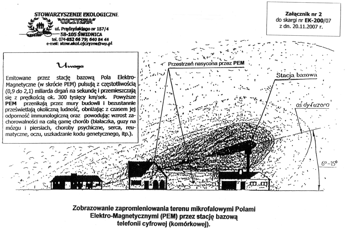 | Nasz nr EK-200/07 Świdnica, data: 20.11.2007 r. SKARGA na dokonane przez 3 Strony Przeciwne manipulacje w prawie ochrony środowiska, zdrowia i prawie budowlanym, godzące w środowisko, zdrowie Narodu i Konstytucję RP. Załącznik: 2. Zobrazowanie zapromieniowania terenu mikrofalowymi Polami Elektro-Magnetycznymi (PEM) przez stację bazową telefonii cyfrowej (komórkowej). więcej: Skarga na dokonane przez 3 Strony Przeciwne manipulacje plik, skarga do premiera Tuska, .doc, 215,3 KB plik PDF oryginalny w całości, .pdf, 2272,6 KB plik, ważniejszych manipulacji w prawie ochrony środowiska, zdrowia i prawie budowlanym, dokonanych w l. 2001-2007 przez Ministra Środowiska, Zdrowia i Ministra Budownictwa, godzących w Konstytucję, środowisko i zdrowie polskiego Narodu., .doc, 276,8 KB | |||
