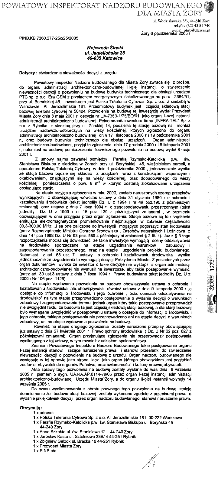 To powinni zobaczyć Polacy, że jest również Nadzór Budowlany w Żorach, który działa profesjonalnie i stanął po stronie prawa oraz po stronie mieszkańców Żor, nie dając się zastraszyć operatorom.07 Oct 2005 Pozdrawiam Zbigniew Gelzok. Powiatowy Inspektor Nadzoru Budowlanego dla Miasta Żory, do Wojewody Śląskiego (.pdf, 168,8 KB) |
