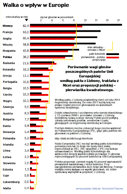 1. Psychologiczny trik. Te intensywne 20 godzinne rokowania nie były ludzkie, zmęczeni ludzie robią przecież błędy. Ta szybkość nie była podyktowana żadną koniecznością- to był trik na który żaden z szefów rządów nie powinien się zgodzić. Ja bym się nigdy nie zdecydował na taki styl komunikacji, jeśliby chodziło o losy milionów ludzi. Ale Baroso wyglądał na nocnej konferencji prasowej całkiem świeżutko. Jak oni wytrzymują - czy oni używają kokainę jak udowadniają badania z brukselskiej centrali parlamentu europejskiego? 2. Oszustwa. Następujące oszustwa są już teraz widoczne: pozostaje większość ustaleń z odrzuconej konstytucji, którą oni teraz nazwali umową podstawową - podobnie jak w BRD (Bundes Republik Deutschland) gdzie zamiast konstytucji panuje prawo podstawowe. Jak w BRD będą się starali zorganizować organy konstytucyjne bez legalnej konstytucji - to jest spisek! 62 lata po wojnie oni w dalszym ciągu uważają, że ludzie są tylko do manipulacji i pracy- pasożyty. Jak Holendry i Francuzi zagłosowali na NIE to oni po prostu zamiast respektować ludzi i dalej się ludzi pytać przez głosowania ludowe- referenda, ale oni robią konstytucję dla globalnych koncernów, a nie dla ludzi. To zdrada i katastrofa ! Trik z prawem podstawowym jest tak długo nieważny jak długo nie zostanie ratyfikowany przez głosowania ludowe. 3. Korupcja większości przedstawicieli. Pierwiastek kwadratowy był korzystny dla wielu krajów: Świadczy to, że szefowie tych krajów reprezentowali głównie własną prywatną kieszeń lub zostali zahipnotyzowani, a nie walczyli o wpływ kraju, których interesy oni powinni reprezentować w Europie. Następujące kraje podobnież w konsultacjach Rady EU nie popierały polskiego systemu podziału głosów pomimo, że byłby on jednoznacznie w interesie tych krajów: Rumunia, Grecja, Portugalia, Belgia, Węgry, Szwecja, Austria, Bułgaria, Dania, Słowacja, Estonia, Finlandia, Irlandia, Litwa, Łotwa, Słowenia, Estonia, Cypr, Luksemburg, Malta Np.: - dla bułgarskiego wicepremiera i ministra spraw zagranicznych Iwajło Kałfina w wywiadzie, publikowanym na łamach największego dziennika sofijskiego"Trud" Europa jest ważniejsza niż interesy Bułgarii. Czyli to podstawiony lub przekupiony zdrajca Narodu Bułgarskiego. Według Iwajło Kałfina, Bułgaria jest zainteresowana silną Unią Europejską, która podejmowałaby realistyczne decyzje i je wykonywała. Minister przyznał, że w systemie głosowania tzw. podwójnej większości, który wejdzie w życie po 2014 r., Bułgaria będzie miała mniejszą wagę. Tłumaczył jednak, że dla Bułgarii o wiele ważniejszym jest by UE funkcjonowała sprawnie, niż posiadanie możliwości blokowania unijnych decyzji. źródło poniżej: podział głosów według pierwiastka kwadratowego w zależności od ilości mieszkańców jest zaznaczony na czerwono. Według umowy z Nicei jest zaznaczony żółtą kreską, a niemiecki system czarnymi belkami. 4. Pospolite ruszenie dla ochrony obywateli przed koncernami na brukselskich papierach. Jeśli Merkel była wstanie przekonać czy zahipnotyzować 20 szefów krajów do głosowania przeciwko własnym interesom to pomimo mocnej pozycji Polski jeszcze przez 10 lat widzę już teraz konieczność organizowania pospolitego ruszenia przeciwko przyszłym nieludzkim decyzjom z Brukseli |