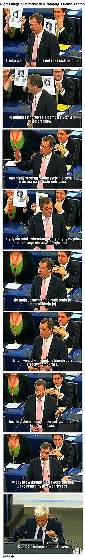 Nigel Farage o Hermanie van Rompuyu i Cathie AshtonTak działa"zjednoczona"Europa 2.12.2009. Proszę koniecznie przeczytać (są polskie napisy) - i obejrzeć- wypowiedź Nigel Farage w "parlamencie" UE. Widać tam też miałkość, tchórzostwo i strach niejakiego Buzka. Aż wstyd... youtube.com/watch?v=etP3f-mNkD4 - w rolach głównych: Nigel Farage, Jerzy Buzek, M.Barroso - miejsce akcji: europarlament - morał: krytyka EU jest zabroniona Najważniejszy fragment: ~ 3 min. 20 sek. Nigel Farage ujawnia powiązania Cathie Ashton z komunistami. Jerzy Buzek daje mu do zrozumienia, że dla dobra Unii nie życzy sobie, by tego typu sprawy były publicznie nagłaśniane, choć p. Ashton została właśnie namaszczona na Wysokiego Reprezentanta Komisji Europejskiej do Spraw Zagranicznych i Bezpieczeństwa. Jeśli chodzi o postawę p. Buzka, doprawdy wstyd... Krzysztof Kowalczyk | ||||||||||||||||||||||||||||||||||||||||||||||||||||||||||||||||||||||||