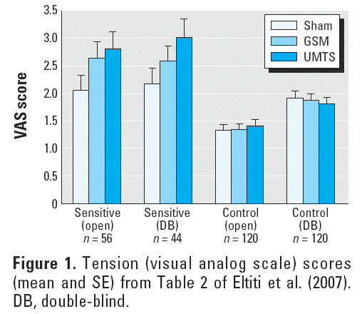 Short-Term Exposure to Mobile Phone Base Station Signals30.1.2008 The full Eltiti-study, .pdf, 183,4 KB Does Short-Term Exposure to Mobile Phone Base Station Signals Increase Symptoms in Individuals Who Report Sensitivity to Electromagnetic Fields? A Double-Blind Randomized Provocation Study Stacy Eltiti, Denise Wallace, Anna Ridgewell, Konstantina Zougkou, Riccardo Russo, Francisco Sepulveda, Dariush Mirshekar-Syahkal, Paul Rasor, Roger Deeble, and Elaine Fox University of Essex, Colchester, Essex, United Kingdom [JUNK SCIENCE] [sensitive people were removed from this study] Abstract: Background: Individuals with idiopathic environmental illness with attribution to electromagnetic fields (IEI-EMF) believe they suffer negative health effects when exposed to electromagnetic fields from everyday objects such as mobile phone base stations. Objectives: This study used both open provocation and double-blind tests to determine if sensitive and control individuals experience more negative health effects when exposed to base station-like signals compared with sham. Methods: Fifty-six self-reported sensitive and 120 control participants were tested in an open provocation test. Of these, 12 sensitive and 6 controls withdrew after the first session. The remainder completed a series of double-blind tests. Subjective measures of well-being and symptoms as well as physiological measures of blood volume pulse, heart rate, and skin conductance were obtained. Results: During the open provocation, sensitive individuals reported lower levels of well-being in both the global system for mobile communication (GSM) and universal mobile telecommunications system (UMTS) compared with sham exposure, whereas controls reported more symptoms during the UMTS exposure. During double-blind tests the GSM signal did not have any effect on either group. Sensitive participants did report elevated levels of arousal during the UMTS condition, whereas the number or severity of symptoms experienced did not increase. Physiological measures did not differ across the three exposure conditions for either group. Conclusions: Short-term exposure to a typical GSM base station-like signal did not affect well-being or physiological functions in sensitive or control individuals. Sensitive individuals reported elevated levels of arousal when exposed to a UMTS signal. Further analysis, however, indicated that this difference was likely to be due to the effect of order of exposure rather than the exposure itself. Address correspondence to S. Eltiti, Department of Psychology, University of Essex, Wivenhoe Park, Colchester, Essex, CO4 3SQ, United Kingdom. Telephone: 44 (0) 1206873784. Fax: 44 (0) 1206873801. E-mail: seltiti@essex.ac.uk We thank all our participants, especially IEI-EMF individuals, for their contribution to our study ; also Red-M for supplying the exposure system, and the National Physical Laboratory for the screened rooms and independent measurements. This project was funded by the Mobile Telecommunications and Health Research Programme grant RUM 20. The views expressed in this article are those of the authors and not necessarily those of the funders. The authors declare they have no competing financial interests. | |||||