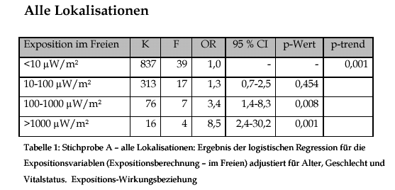 | 8 | "Naila-Mobilfunk-Senderstudie" 2004 (Eger et al.) .pdf, 96,5 KB; in english .pdf, 371 KB | Dreifache Zunahme von Krebsfällen |