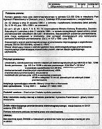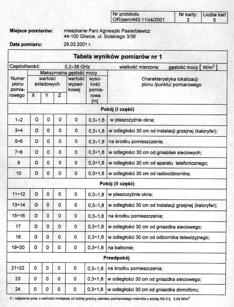 Śląska Wojewódzka Stacja Sanitarno-EpidemiologicznaOddział Ochrony Radiologicznej, Pracownia Zagrożeń Elektromagnetycznych ul. Raciborska 39, 40-957 Katowice 2 skrytka pocztowa 591 PROTOKÓŁ nr OR / pem / 433 - 11 / oś / 2001 Z POMIARÓW GĘSTOŚCI MOCY PROMIENIOWANIA ELEKTROMAGNETYCZNEGO O CZĘSTOTLIWOŚCI 300 MHz - 300 000 MHz wykonanych dla celów ochrony środowiska w mieszkaniu Pani Agnieszki Pasierbiewicz w Gliwicach, przy ul. Solskiego 3/38. Data pomiaru 29.03.2001 r. Tabela wyników pomiarów nr 1, pokój, przedpokój 0 - natężenie pola o wartości mniejszej od dolnej granicy zakresu pomiarowego miernika z sondą AS-3 tj. 0,04 W/m2 | |||||