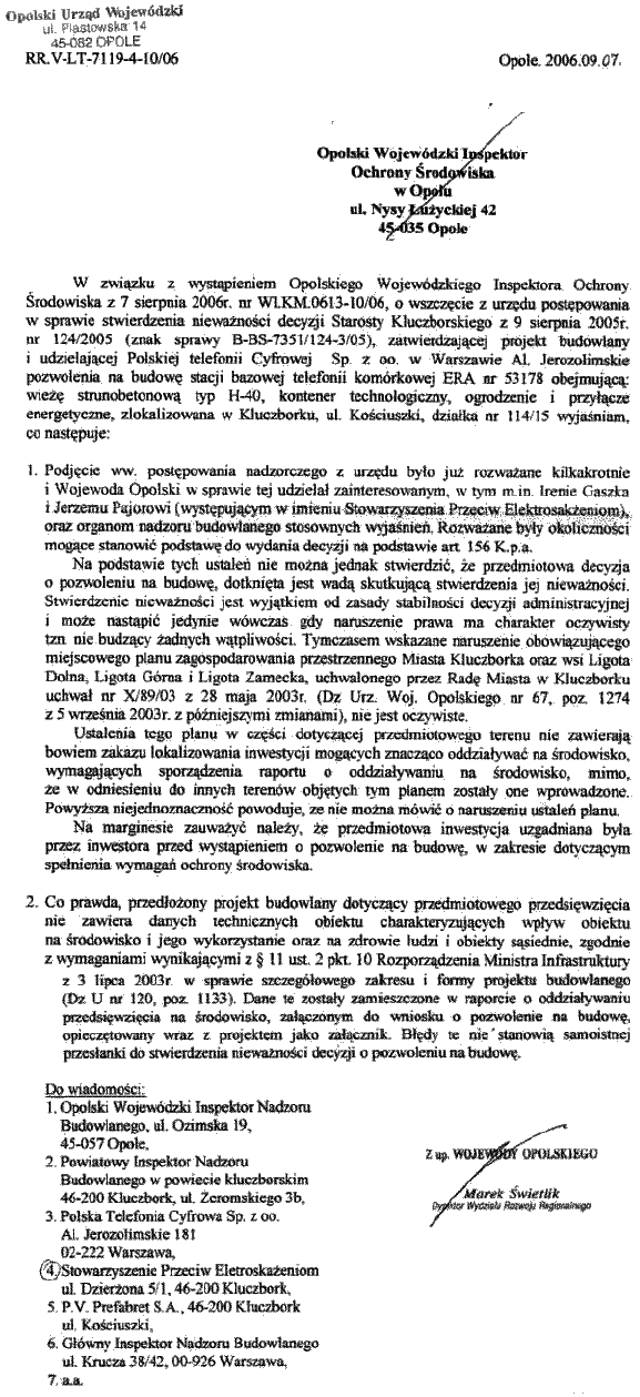 List Gelzoka do Opolski Urząd Wojewódzki Wydział Rozwoju Regionalnego, Świetlik Marek Rybnik 2005-12-12 Stowarzyszenie Przeciwko Elektroskażeniom "Prawo do życia" Gelzok Zbigniew Ul. Bracka 16 A 44-251 Rybnik 9 Opolski Urząd Wojewódzki Piastowska 14 45-082 Opole Wydział Rozwoju Regionalnego Świetlik Marek Z uwagi na otrzymane pismo z dnia 07.12.2005 roku RR.V-LT-7119-25-4/05 oświadczam, że zgodnie z przesądzonym orzecznictwem i dokumentami, z jakimi się zapoznałem w powyższej sprawie doszło do przestępstwa, którego dopuścił się pan Lewandowski, a pozostawienie w obiegu bezprawnej decyzji spowoduje utratę potrzebnego zaufania społecznego w stosunku do Wojewody Opolskiego. Decyzja wydana w sprawie pozwolenia na budowę stacji bazowej telefonii komórkowej w Kluczborku ERA GSM nr 53178 jest sprzeczna z obowiązującymi przepisami a mianowicie, 1. Autor planu zagospodarowania przestrzennego w swej opinii z dnia 27.10-2005 roku skierowanej do pana Edwarda Kłosowskiego Kierownika Referatu Geodezji i Gospodarki Gruntami jednoznacznie stwierdza, że planowana inwestycja jest niezgodna z planem zagospodarowania terenu, co wyklucza możliwość udzielenia pozwolenia na budowę. 2. Operator telefonii komórkowej nie mógł otrzymać pozwolenia na budowę z uwagi Prawo Budowlane Art. 4. Każdy ma prawo zabudowy nieruchomości gruntowej, jeżeli wykaże prawo do dysponowania nieruchomością na cele budowlane, pod warunkiem zgodności zamierzenia budowlanego z przepisami. ERA GSM nie jest właścicielem terenu PKP, dlatego doszło do naruszenia przepisów wynikających z KONSTYTUCJA RZECZYPOSPOLITEJ POLSKIEJ z dnia 2 kwietnia 1997 r. Art. 2. Rzeczpospolita Polska jest demokratycznym państwem prawnym, urzeczywistniającym zasady sprawiedliwości społecznej. Art. 4. 1. Władza zwierzchnia w Rzeczypospolitej Polskiej należy do Narodu. 2. Naród sprawuje władzę przez swoich przedstawicieli lub bezpośrednio. Art. 5. Rzeczpospolita Polska strzeże niepodległości i nienaruszalności swojego terytorium, zapewnia wolności i prawa człowieka i obywatela oraz bezpieczeństwo obywateli, strzeże dziedzictwa narodowego oraz zapewnia ochronę środowiska, kierując się zasadą zrównoważonego rozwoju. Art. 21. 1. Rzeczpospolita Polska chroni własność i prawo dziedziczenia. 2. Wywłaszczenie jest dopuszczalne jedynie wówczas, gdy jest dokonywane na cele publiczne i za słusznym odszkodowaniem. Kto w takim razie pozwolił na naruszenie cudzej własności operatorowi telefonii komórkowej (to jest komercyjny biznes). 3. Wojewódzki Inspektor Sanitarny w Opolu w piśmie z dnia 2005.06.02 Nr NZ/ZD-4326-29/05 zobowiązał przedstawiciela operatora o wystąpienie do Urzędu Miejskiego w Kluczborku o wprowadzenie zapisu do miejscowego planu zagospodarowania przestrzennego, obejmującego teren działki nr 114/15 i działek sąsiednich w Kluczborku zakazującego budowę obiektów o wysokości przekraczającej 36 m w promieniu 46 metrów czego nie zrobiono, bo jest to niedopuszczalne dla komercyjnego operatora, wobec czego wniosek pozwolenia był bezprzedmiotowy, o czym wiedział operator. 4.Zgodnie z przyjętym przesadzonym orzecznictwem Sądów Administracyjnych będących również stanowiskiem Głównego Inspektora Nadzoru Budowlanego warunki zabudowy i zagospodarowania terenu były obowiązkowe i konieczne. Zgodnie również z obowiązującymi przepisami Prawa Ochrony Środowiska przedsięwzięcie jest to. Art. 46. 1. Wydanie decyzji w sprawie planowanego przedsięwzięcia mogącego znacząco oddziaływać na środowisko wymaga, z zastrzeżeniem ust. 7, przeprowadzenia postępowania w sprawie oceny oddziaływania na środowisko. 2. Ilekroć w przepisach niniejszego działu jest mowa o przedsięwzięciu, rozumie się przez to inwestycje budowlana lub inna ingerencje w środowisko, polegająca na przekształceniu lub zmianie sposobu wykorzystania terenu, w tym również na wydobywaniu kopalin, wymagająca decyzji, o której mowa w ust. 4. . Wystarczyło tylko znać ten przepis, aby stwierdzić, że dana inwestycja nie jest zgodna z prawem a o zgodności przesądza W tej kwestii wypowiedział się NSA ośrodek zamiejscowy w Gdańsku w wyroku z dnia 28.05.2oo2r.sygn. akt II S.A./Gd2090/99 oraz w wyroku z dnia 1O.1O.2oo1r. sygn. akt II S.A./Gd 1346/99,-" Z oceny oddziaływania na środowisko stacji bazowej sporządzonej dla potrzeb niniejszego postępowania wynika, iż inwestycja zalicza się do inwestycji mogących pogorszyć stan środowiska dla których tworzy się obszar ograniczonego użytkowania. Powoduje to w konsekwencji zmiany sposobu zagospodarowania terenu i - stosownie do art. 39 ust. 2 pkt. 1 ustawy z dnia 07.07.1994r. o zagospodarowaniu przestrzennym- wymaga uzyskania decyzji o warunkach zabudowy i zagospodarowania terenu," oraz NSA ośrodek zamiejscowy w Lublinie w wyroku z dnia 17.5)5.2oo2r.sygn. akt II S.A./Lu 190/2001stwierdzajac, że "Celem postępowania o ustalenie "'warunków zabudowy i zagospodarowania terenu jest przesadzenie o zgodności planowanej inwestycji z zapisami miejscowego planu zagospodarowania przestrzennego. Jeśli przeznaczenie terenu określone w planie miejscowym nie pozostaje w kolizji z lokalizacja telefonii komórkowej, dopuszczalne jest uwzględnienie wniosku w tym przedmiocie". Ponadto NSA w Uchwale Składu Pięciu Sędziów z dnia 15.02.1999r.OPK 13/98 ONSA 1999/3poz. 79 zajął następujące stanowisko: "Stacje te, aczkolwiek są inwestycjami szczególnego typu, dadzą się ująć w mniej lub bardziej pojemnych pojęciach zbiorczych. które gmina ma prawo zamieścić w planie, a zadaniem organu stosującego prawo ( ustalającego warunki zabudowy i zagospodarowania terenu) jest ocena, czy stacja bazowa telefonii komórkowej mieści się, czy tez nie mieści w określonym pojęciu zbiorczym planu miejscowego". Z przytoczonych powyżej orzeczeń NSA wynika. że realizacja inwestycji polegających na budowie stacji bazowych. Wymaga uzyskania de