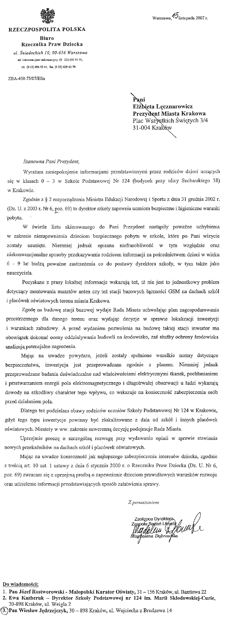 15. Nov. 2007, Schreiben von dem Kinderschutzbeaftragten der polnischen Regierung an den Stadtpräsidenten von Kraków (Krakau), Frau Elżbieta Lęcznarowicz Auszüge: ... Laut des Briefes an Sie Frau Präsident, fanden ernsthafte Versäumnisse im Bezug auf die fehlende Gewährleistung der sicheren Aufenthalt der Kinder in der Schule statt. ..... wenn alle Sicherheitsauflagen erfüllt werden, dann würde diese Investition nach Plan verlaufen. Trotzdem, die durchgeführten Studien der elektrischen Eigenschaften von Gewebe, von der Absorption und von der Umwandlung der elektromagnetischen Energie im Körper und Langzeitbeobachtungen bei Menschen, weisen auf den gesundheitsschädigenden Charakter solcher Einflüsse hin, was auf die Notwendigkeit der Absicherung von Personen gegen die Wirkung des Feldes hinweist. ... Darum teile ich die Befürchtungen von Eltern der Schüler an der Grundschule Nr. 124 in Krakau. Solche Investitionen gehören weit weg von den Schulen und von den anderen öffentlichen schulischen Einrichtungen entfernt. Leider auf diesem Gebiet die entscheidenden, unabhängigen Beschlüsse faßt der Stadtrat. Hiermit bitte ich Sie um besondere Sorgfalt bei der Beurteilung bezüglich der neuen Sendeanlagen auf Dächern von Schulen und von weiteren schulischen Einrichtungen. |