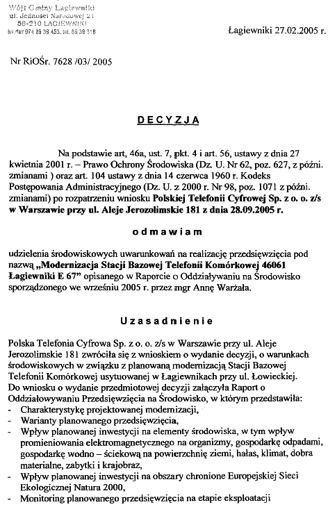 6 Marzec 2006 Od: Gelzok Szanowny Panie ! Taką decyzję wydał Wójt Gminy Łagiewniki Janusz Guzek, który bezpieczeństwo ludzi oraz ich interes prawny stawia ponad interesem operatora ERA GSM. Brakujace strony to załączniki, opinia pana Kłoszewskiego,wykresy i cała reszta.Ciekawe co Era zrobi. Pozdrawiam Zbigniew Gelzok.