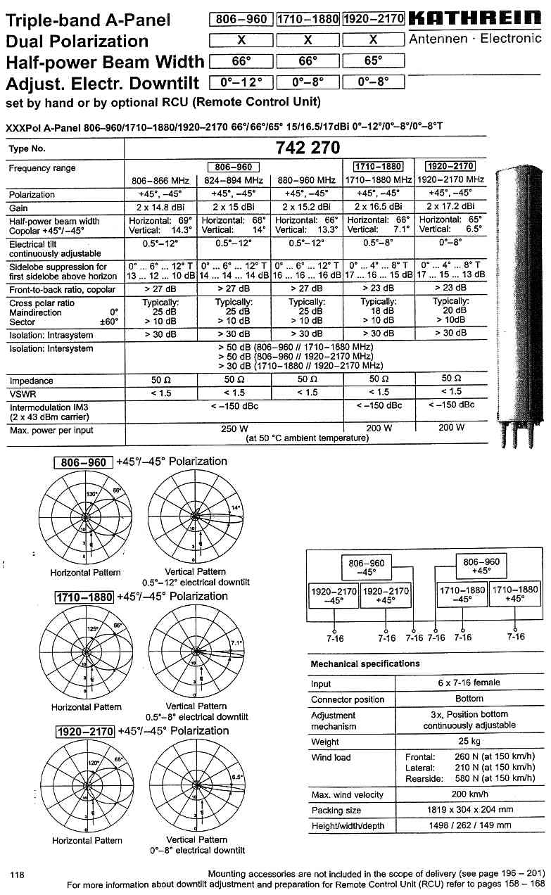 Lublin, Raport o oddziaływaniu na środowisko, Kathrein Tripleband A-Panel 1710-1880 Adjust. Electrical Downtilt set by hand or by optional (RCU Remote Control Unit) ERA Nr 27063 Lublin-LSM str 30