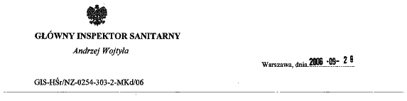 Lublin-zwycięstwo, potwierdzenie decyzji Wojewódzkiego Inspektora Sanitarnego w Lublinie przez Głównego Inspektora Sanitarnego Andrzeja Wojtyłę17.10.06 ![]() |