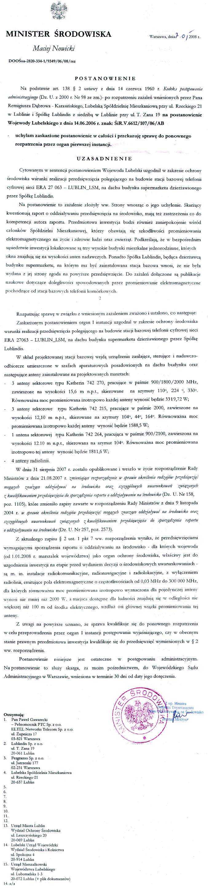 Odzywam Sie po długim czasie, ale dopiero teraz otrzymałem pismo z Ministerstwa Środowiska uchylające decyzję Wojewody Lubelskiego w sprawie wydania zgody na budowę anten na dachu hipermarketu E.Leclerc w Lublinie. Jest do druga decyzja (pierwszą wydał Główny Inspektor Sanitarny) uchylająca decyzję lubelskich urzędników.