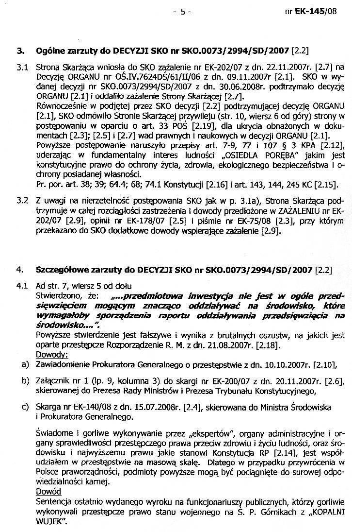Stowarzyszenie Ekologiczne Ojczyzna 58-105 Świdnica Lublin. Skarga o uchylenie Decyzji SKO z dnia 30.06.2008r. Ogólne i szczegółowe zarzuty do decyzji SKO nr SKO.0073/2994/SD/2007. Świadome i gorliwe wykonywanie przez "ekspertów", organy administracyjne i organy sprawiedliwości przestępczego prawa przeciw zdrowiu i życiu ludności, oraz środowisku i najwyższemu prawu jakie stanowi Konstytucja RP, jest współudziałem w przestępstwie na masową skalę. Dlatego w przypadku przywrócenia w Polsce praworządności, podmioty powyższe mogą być pociągnięte do surowej odpowiedzialności karnej. Strona skarżąca: Stowarzyszenie Ekologiczne Ojczyzna 58-105 Świdnica Strona przeciwna: Samorządowe Kolegium Odwoławcze w Lublinie ul. Zana 38c 20-601 Lublin Skarga nr EK-145/08 o uchylenie Decyzji SKO z dnia 30.06.2008r. oraz Decyzji Prezydenta Lublina z dnia 9.11.2007r. |