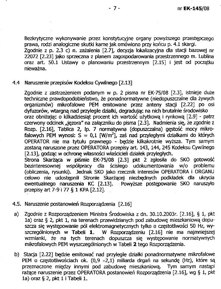 Stowarzyszenie Ekologiczne Ojczyzna 58-105 Świdnica Lublin. Skarga o uchylenie Decyzji SKO z dnia 30.06.2008r. Ogólne i szczegółowe zarzuty do decyzji SKO nr SKO.0073/2994/SD/2007. Decyzja lokalizacyjna dla stacji bazowej nr 22072 jako sprzeczna z planem zagospodarowania przestrzennego m. Lublina oraz art. 50.1 Ustawy o planowaniu przestrzennym i jest od początku nieważna. Naruszenie przepisów Kodeksu Cywilnego, naruszenie postanowień rozporządzenia.