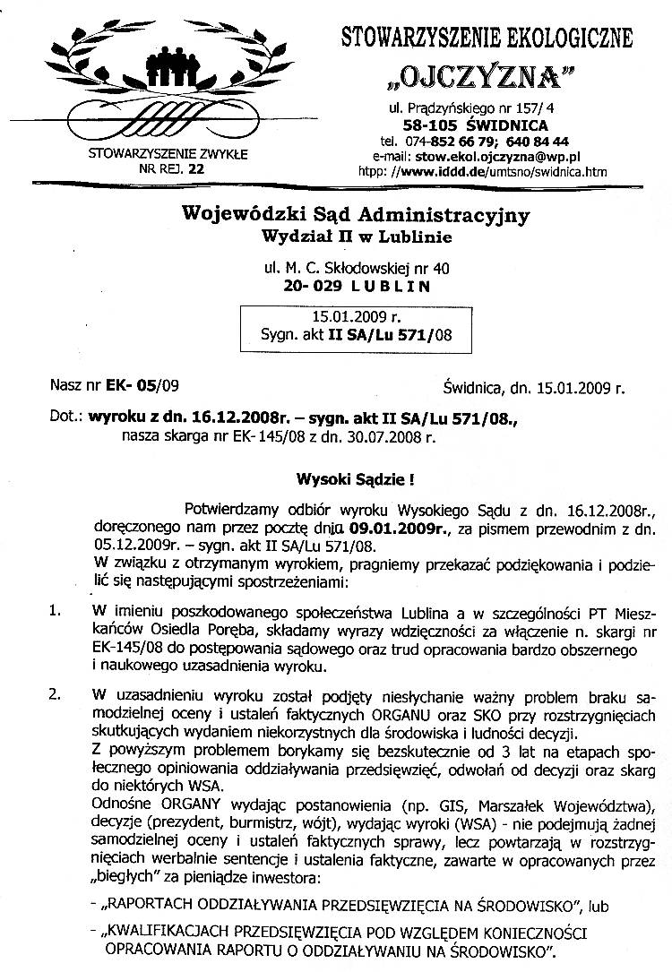 Lublin. Stowarzyszenie Ekologiczne Ojczyzna 58-105 Świdnica 15.01.2009r. W imieniu poszkodowanego społeczeństwa Lublina a w szczególności PT Mieszkańców Osiedla Poręba, składamy wyrazy wdzięczności za włączenie n. skargi nr EK-145/08 do postępowania sądowego oraz trud opracowania bardzo obszernego i naukowego uzasadnienia wyroku.