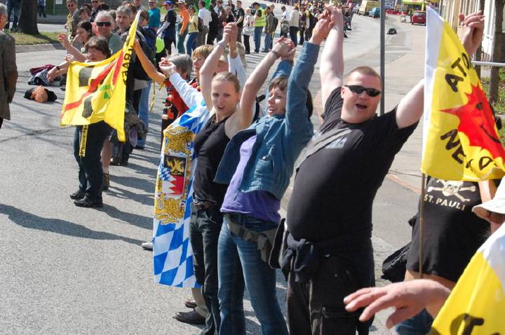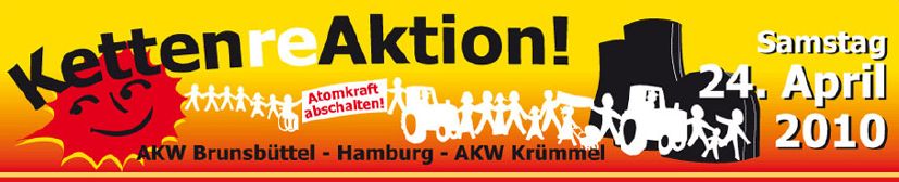 | Reakcja Łańcuchowa była akcją zorganizowaną przez: KETTENreAKTION ist eine Aktion von: Arbeitsgemeinschaft Schacht KONRAD, Attac Deutschland, .ausgestrahlt - gemeinsam gegen Atomenergie, Bundesverband Erneuerbare Energien e.V., Bund für Umwelt- und Naturschutz - BUND, Bündnis 90 / Die Grünen, Campact, DGB Nord, Deutscher Naturschutzring - DNR, Deutsche Umwelthilfe - DUH, Die Linke, Dr. Thomas Schaack - Umweltbeauftragter der Nordelbischen Kirche, Eurosolar, Evangelische Jugend Hamburg, Forum gemeinsam gegen das Zwischenlager und für eine verantwortungsvolle Energiepolitik (Gundremmingen), Grüne Jugend, IG Metall Küste, IG Metall Niedersachsen und Sachsen-Anhalt, IG Metall Unterelbe, Internationale Ärzte für die Verhütung des Atomkrieges - IPPNW, Jungsozialisten in der SPD - Jusos, die Klima-Allianz, Naturfreunde Deutschlands, Sozialdemokratische Partei Deutschland - SPD, Umwelthaus am Schüberg des Ev-Luth. Kirchenkreises Hamburg-Ost, ver.di Nord.hlt | |||||