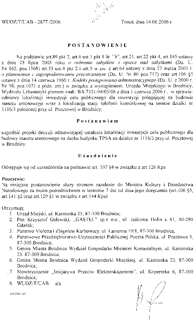 Brodnica, 16 i ostatnia odmowa na iddd.de od 21.7.2008r. plik oryginalny, (.pdf, 388,4 KB) Brodnica, dnia 9 lipca 2008r. DECYZJA NR BA. 7331 - 162/P/06/07/08 Na podstawie art. 104 Kodeksu postępowania administracyjnego (Dz.U. z 2000 r. Nr 98 poz. 1071 z pozn. zm.) oraz art. 1 ust. 2 pkt 1 , 2, 6, 9 i art. 6 ust.2 pkt 1 ustawy z dnia 27 marca 2003r. o planowaniu i zagospodarowaniu przestrzennym (Dz. U. Nr 80, poz.717 z pózn.zm.) po rozpatrzeniu wniosku: z dnia 11 grudnia 2006r. Pana Krzysztofa Galewskiego działającego z upoważnienia Polskiej Telefonii Komórkowej CENTERTEL sp. z.o.o. z siedzibą w Warszawie przy ul. Skierniewickiej 10A w sprawie wydania decyzji o ustaleniu lokalizacji inwestycji celu publicznego polegającej na budowie masztu antenowego o wysokości do 30,O m wraz z lokalizacją stacji bazowej telefonii komórkowej CENTERTEL i z przyłączem elektroenergetycznym na terenie działki nr 1116/3 położonej przy ul. Pocztowej w Brodnicy. odmawiam ustalenia lokalizacji inwestycji celu publicznego Polskiej Telefonii Komorkowej "Centertel" sp. z 0.0. z siedzibą w Warszawie przy ulicy Skierniewickiej 10A dla inwestycji polegającej na budowie masztu antenowego o wysokości do 30,O m wraz z lokalizacją stacji bazowej telefonii komórkowej PTK CENTERTEL na dachu budynku TP SA zlokalizowanym na terenie działki nr 1116/3 położonej przy ul. Pocztowej w Brodnicy. ..."Planowana inwestycja godzi również w interes publiczny (art. 1 ust. 2, pkt 9 ustawy o planowaniu i zagospodarowaniu przestrzennym). ,,lnteres publiczny rozumiany jako uogólniony cel dążeń i działań uwzględniających zobiektywizowane potrzeby ogółu społeczeństwa lub lokalnych społeczności, związanych z zagospodarowaniem przestrzennym. Protest lokalnej społeczności wobec przedmiotowej inwestycji daje podstawę do stwierdzenia, że cel inwestycji określany mianem ,,celu publicznego" nie znajduje akceptacji społecznej." | |||||