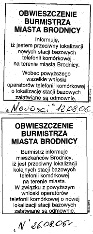 Brodnica, odmowa nr 10: lokalizacja stacji bazowej telefonii komórkowej narusza interes prawny właścicieli i użytkowników wieczystych nieruchomości zlokalizowanych w obszarze oddziaływania stacji bazowej.Odmowa ustalenia lokalizacji stacji PTC sieci Era, 8 maja 2006 14 maja 2006 r. Przesyłam panu nową decyzję z Brodnicy, która w świetle prawa zamyka operatorowi drogę do budowy stacji bazowej telefonii komórkowej. Niech inni włodarze biorą przykład. Decyzja jest nie do podważenia. Zbigniew Gelzok. ".. Przez lokalizację stacji bazowej na działce nr 2398/15 właściciele działek sąsiednich mieliby ograniczone prawo do zagospodarowania swojej nieruchomości. A zatem lokalizacja stacji bazowej telefonii komórkowej na działce nr 2398/15 narusza chronione prawem interesy właścicieli i użytkowników wieczystych działek sąsiednich a Wnioskodawca nie ma tytułu prawnego do zagospodarowania działek sąsiednich." patrz oryginalny dokument, .pdf, 145 KB |