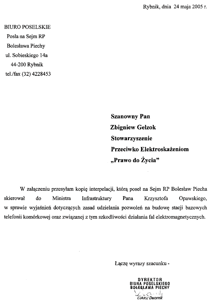 Stowarzyszenie Przeciwko Elektroskażeniom Rybnik 2005-06-04 "Prawo do życia" Gelzok Zbigniew Ul. Bracka 16 A 44-251 Rybnik 9 Wojewoda Ślaski Ślaski Urząd Wojewódzki w Katowicach Przez Śląski Urząd Wojewódzki w Katowicach, Wydział Rozwoju Regionalnego Ul. Jagiellońska 25 40-032 Katowice. W związku z tym, że operatorzy twierdzą że stacje bazowe telefonii komórkowej mogą być budowane na zgłoszenie chciałbym uzyskać jednoznaczną odpowiedź zanim zwróce się do wszystkich możliwych instytucji. 1. Zgodnie z opiniami klubów poselskich, władz jak i Wojewody Śląskiego stacje bazowe telefonii komórkowej są budowane, a nie montowane i zgodnie z poniższymi przepisami jedynie w następujacy sposób mogą być zatwierdzone w drodze decyzji. "Prawo Ochrony Środowiska" Art.46. 1. Wydanie decyzji w sprawie planowego przedsięwzięcia mogąco znacząco oddziaływać na środowisko wymaga, z zastrzeżeniem ust. 7. przeprowadzenia postępowania w sprawie oceny oddziaływania na środowisko. 4. Decyzją, o której mowa w ust. 1, jest: 1) decyzja o warunkach zabudowy i zagospodarowania terenu-wydawana na podstawie przepisów ustawy o planowaniu i zagospodarowaniu przestrzennym, 2) decyzja o pozwoleniu na budowę obiektu budowlanego oraz decyzja o pozwoleniu na zmianę sposobu użytkowania obiektu budowlanego lub jego części, wydawana na podstawie ustawy z dnia 7 LIPCA 1994 r.- Prawo budowlane. Oczekuje odpowiedzi na powyższe i czy Wojewoda Śląski zgadza się z tym. 2. Proszę o odpowiedż czy jakakolwiek budowa stacji bazowej telefonii komórkowej nie jest przedsięwzięciem mogąco znacząco oddziaływać na środowisko. 3. Czy w świetle przepisów i ustaw jest odstępstwo od powyższego albowiem zgłoszenia operatorów w niektórych przypadkach nie dotyczą przedsięwzięcia tylko montażu urządzeń zgodnie z Prawem Budowlanym co nie dotyczy budowy stacji bazowej telefonii komórkowej i tym samym taka forma zgłoszenia nie ma żadnego umocowania prawnego i automatycznie powoduje, iż ma zastosowanie , "Prawo Ochrony Środowiska" Art. 11 więcej |