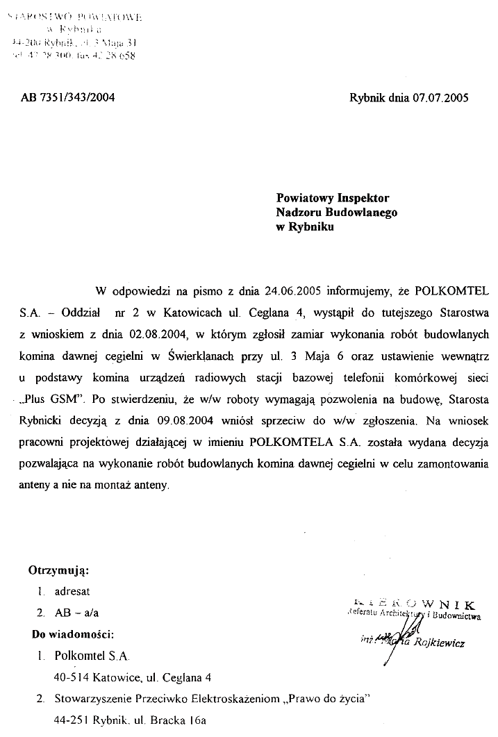Dokument Prezydenta Miasta Rybnika z którego jasno wynika, że urzędnik Janusz Piekarczyk zlekceważył mieszkańców Ochojca, okłamał Prezydenta w tamtej sprawie oraz Pan Prezydent Miasta Rybnik Adam Fudali przyznaje, że legalizacja montażu stacji bazowych telefonii komórkowej opiera się o pozwoleniu na budowę, a nie na zgłoszeniu, co podkreślił w piśmie. Nieuznawanie stowarzyszenia za stronę to sprawa pana Adama Wolnego z Urzędu Wojewódzkiego, który jest na usługach operatorów i to nie podlega dyskusji, dla nich łamie prawo. Pozdrawiam Zbigniew Gelzok. 01 Jul 2005 patrz odpowiedź prezydenta, pdf, 128 KB |