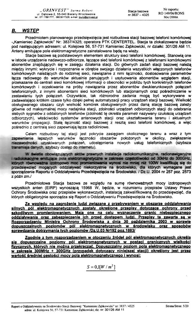 Wstęp. Raport o oddziaływaniu przedsięwzięcia na środowisko nr RO 149/06/RONS rozbudowa stacji bazowej nr 3837/4325 "Kamieniec Ząbkowicki" PTK Centertel Orange (France Telecom) w Kamieńcu Ząbkowickim. EIRP "jest?" 15968 W (>100 W), Nr działki 301/26 AM 11, 57-731 Kamieniec Ząbkowicki, Kolejowa 56, autorem opracowania jest mgr inż. Robert Surma, mai 2006, Grinvest. | ||