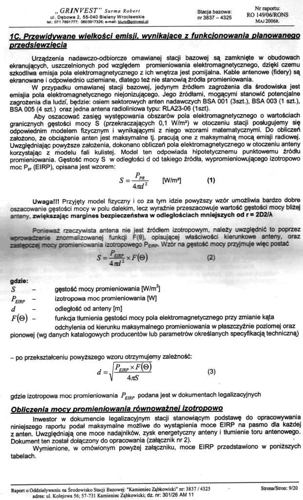 Przewidywane wielkości emisji, wynikające z funkcjonowania planowanego przedsięwzięcia. Obliczenia mocy promieniowania równoważnej izotropowo. Parametry techniczne anteny radioliniowej i anten sektorowych. Raport o oddziaływaniu przedsięwzięcia na środowisko nr RO 149/06/RONS rozbudowa stacji bazowej nr 3837/4325 "Kamieniec Ząbkowicki" PTK Centertel Orange (France Telecom) w Kamieńcu Ząbkowickim. EIRP "jest?" 15968 W (>100 W), Nr działki 301/26 AM 11, 57-731 Kamieniec Ząbkowicki, Kolejowa 56, autorem opracowania jest mgr inż. Robert Surma, mai 2006, Grinvest. | ||
