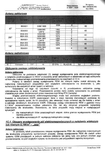 Anteny sektorowe, anteny radioliniowe, obliczenia zasięgu oddziaływania, obszary występowania pól EM o natężeniu większym niż 0,1 W/m2.. Raport o oddziaływaniu przedsięwzięcia na środowisko nr RO 149/06/RONS rozbudowa stacji bazowej nr 3837/4325 "Kamieniec Ząbkowicki" PTK Centertel Orange (France Telecom) w Kamieńcu Ząbkowickim. EIRP "jest?" 15968 W (>100 W), Nr działki 301/26 AM 11, 57-731 Kamieniec Ząbkowicki, Kolejowa 56, autorem opracowania jest mgr inż. Robert Surma, mai 2006, Grinvest.