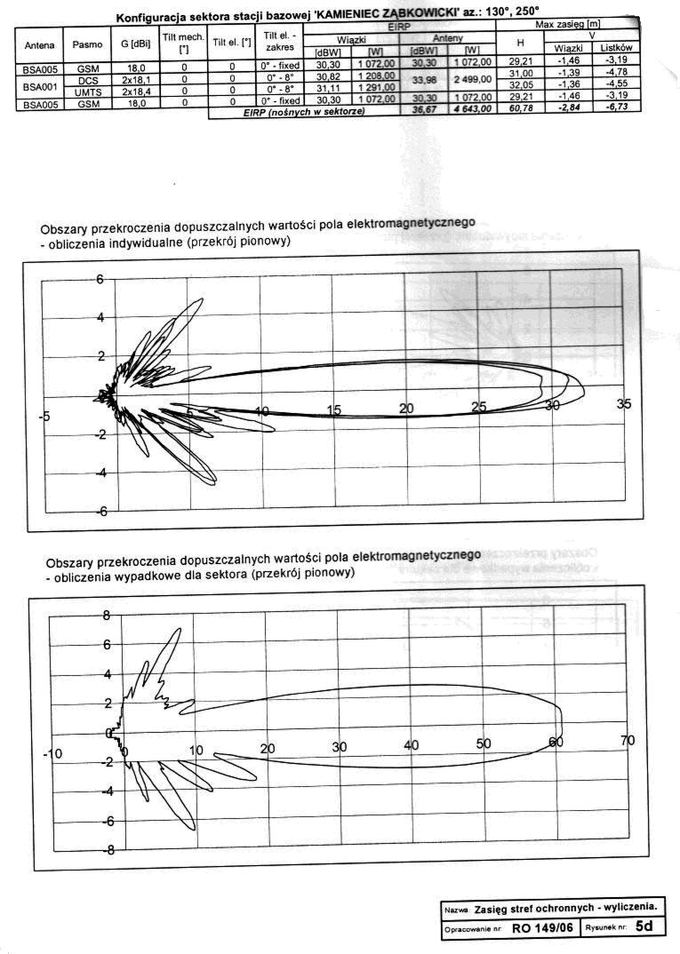 | Konfiguracja sektora az.:130 grad, 250 grad. Tilt el. 0 grad. Zasięg stref ochronnych. Obszary przekroczenia dopuszczalnych wartości pola elektromagnetycznego - przekrój pionowy, obliczenia indywidualne, obliczenia wypadkowe dla sektora. Raport o oddziaływaniu przedsięwzięcia na środowisko nr RO 149/06/RONS rozbudowa stacji bazowej nr 3837/4325 "Kamieniec Ząbkowicki" PTK Centertel Orange (France Telecom) w Kamieńcu Ząbkowickim. EIRP "jest?" 15968 W (>100 W), Nr działki 301/26 AM 11, 57-731 Kamieniec Ząbkowicki, Kolejowa 56, autorem opracowania jest mgr inż. Robert Surma, mai 2006, Grinvest. puknięcie powoduje powiększenie | ||