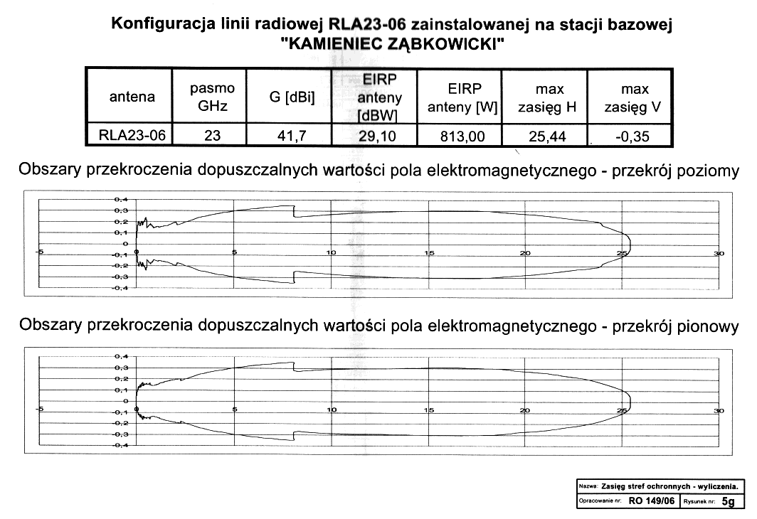 | Konfiguracja linii radioliniowej RLA23-06 zainstalowanej na stacji bazowej "Kamieniec Ząbkowicki". Obszary przekroczenia dopuszczalnych wartości pola elektromagnetycznego - przekrój poziomy i pionowy. Raport o oddziaływaniu przedsięwzięcia na środowisko nr RO 149/06/RONS rozbudowa stacji bazowej nr 3837/4325 "Kamieniec Ząbkowicki" PTK Centertel Orange (France Telecom) w Kamieńcu Ząbkowickim. EIRP "jest?" 15968 W (>100 W), Nr działki 301/26 AM 11, 57-731 Kamieniec Ząbkowicki, Kolejowa 56, autorem opracowania jest mgr inż. Robert Surma, mai 2006, Grinvest. | ||
