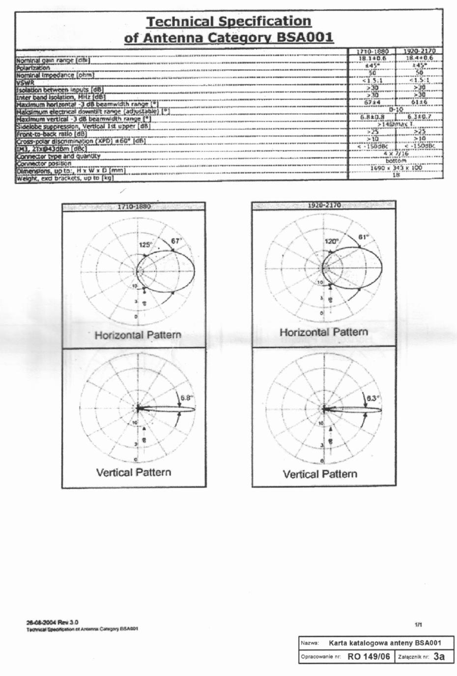 | Technical Specification of Antenna Category BSA001 Raport o oddziaływaniu przedsięwzięcia na środowisko nr RO 149/06/RONS rozbudowa stacji bazowej nr 3837/4325 "Kamieniec Ząbkowicki" PTK Centertel Orange (France Telecom) w Kamieńcu Ząbkowickim. EIRP "jest?" 15968 W (>100 W), Nr działki 301/26 AM 11, 57-731 Kamieniec Ząbkowicki, Kolejowa 56, autorem opracowania jest mgr inż. Robert Surma, mai 2006, Grinvest. | ||