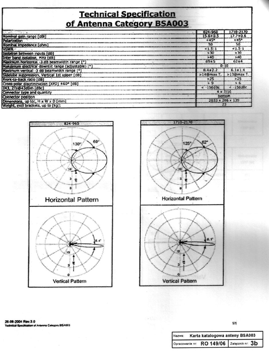 | Technical Specification of Antenna Category BSA003 Raport o oddziaływaniu przedsięwzięcia na środowisko nr RO 149/06/RONS rozbudowa stacji bazowej nr 3837/4325 "Kamieniec Ząbkowicki" PTK Centertel Orange (France Telecom) w Kamieńcu Ząbkowickim. EIRP "jest?" 15968 W (>100 W), Nr działki 301/26 AM 11, 57-731 Kamieniec Ząbkowicki, Kolejowa 56, autorem opracowania jest mgr inż. Robert Surma, mai 2006, Grinvest. | ||