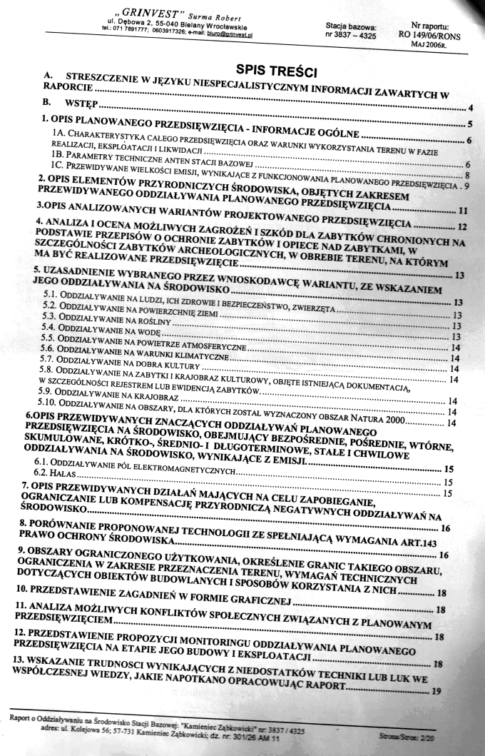 Spis treści. Raport o oddziaływaniu przedsięwzięcia na środowisko nr RO 149/06/RONS rozbudowa stacji bazowej nr 3837/4325 "Kamieniec Ząbkowicki" PTK Centertel Orange (France Telecom) w Kamieńcu Ząbkowickim. EIRP "jest?" 15968 W (>100 W), Nr działki 301/26 AM 11, 57-731 Kamieniec Ząbkowicki, Kolejowa 56, autorem opracowania jest mgr inż. Robert Surma, mai 2006, Grinvest. | ||