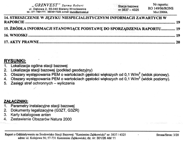 Spis treści ciąg dalszy. Raport o oddziaływaniu przedsięwzięcia na środowisko nr RO 149/06/RONS rozbudowa stacji bazowej nr 3837/4325 "Kamieniec Ząbkowicki" PTK Centertel Orange (France Telecom) w Kamieńcu Ząbkowickim. EIRP "jest?" 15968 W (>100 W), Nr działki 301/26 AM 11, 57-731 Kamieniec Ząbkowicki, Kolejowa 56, autorem opracowania jest mgr inż. Robert Surma, mai 2006, Grinvest. | ||