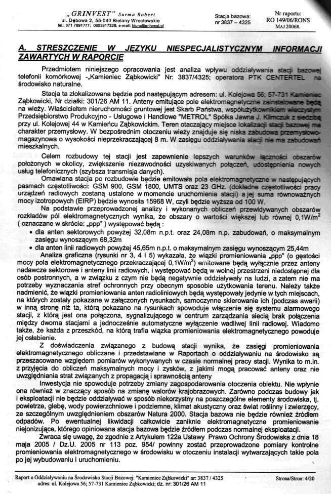 Streszczenie w języku niespecjalistycznym informacji zawartych w raporcie. Raport o oddziaływaniu przedsięwzięcia na środowisko nr RO 149/06/RONS rozbudowa stacji bazowej nr 3837/4325 "Kamieniec Ząbkowicki" PTK Centertel Orange (France Telecom) w Kamieńcu Ząbkowickim. EIRP "jest?" 15968 W (>100 W), Nr działki 301/26 AM 11, 57-731 Kamieniec Ząbkowicki, Kolejowa 56, autorem opracowania jest mgr inż. Robert Surma, mai 2006, Grinvest. | ||