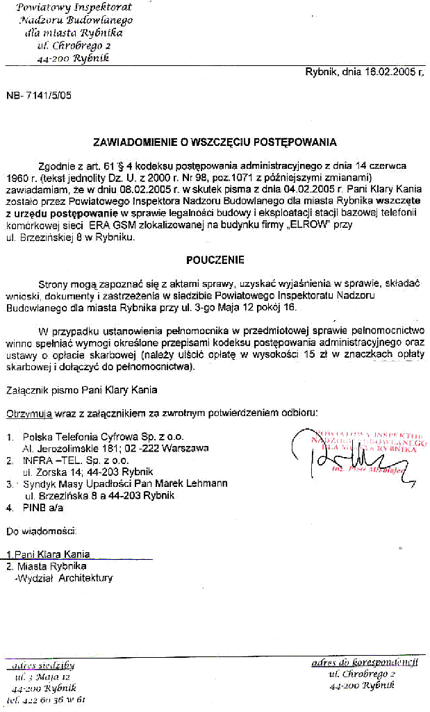 13.04.05, Prezydent Miasta Rybnika odmówił udzielenia pozwolenia na budowę stacji na dachu budynku "ELROW"