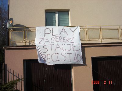 Play ucieka "..Jeżeli na siłę nawet byśmy nadajnik zainstalowali, to w nocy ludzie i tak go spalą. Marcin Gruszka, rzecznik sieci Play" (8 luty 2008 Promieniowanie nas zabije, Marcin Kobiałka, Gazeta Rzeszów) plik oryginalny, .doc, 81,8 KB Mieszkańcy ul. Tarnowskiej w Rzeszowie pełnią całodobowe patrole, by zablokować uruchomienie obok swoich domów masztu sieci komórkowej Play. W piątek wygrali drugą bitwę - Jestem właścicielką domu i nikt mnie nie pytał, czy zgodzę się na zamontowanie na dachu masztu sieci komórkowej - przekonywała Walentyna Graboś (na zdjęciu z dokumentami w rękach.