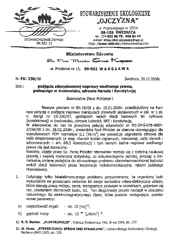 Dot.: Ministerstwo Zdrowia Ewa Kopacz, podjęcia zdecydowanej naprawy wadliwego prawa, godzącego w środowisko, zdrowie Narodu i Konstytucję. EK-238/08